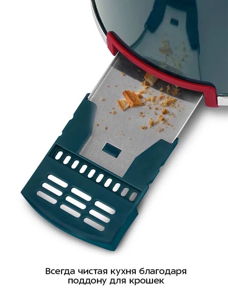 Корпус прибора выполнен из пластика со вставками из металла. Съемный поддон для крошек позволяет легко очистить тостер от хлебных крошек. Для удобного хранения на дне устройства предусмотрены держатели для шнура питания. Противоскользящие вставки на ножках делают тостер более устойчивым.