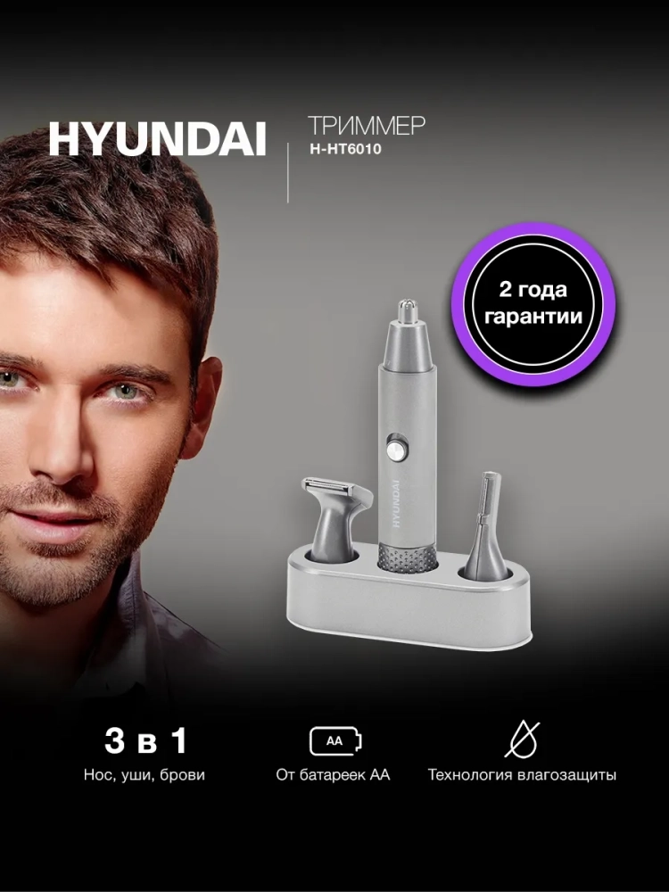 Триммер Hyundai H-HT6010 графитовый/черный, насадок в комплекте 3шт, питание от батарей AA, для бровей и бакенбард, для носа и ушей.
