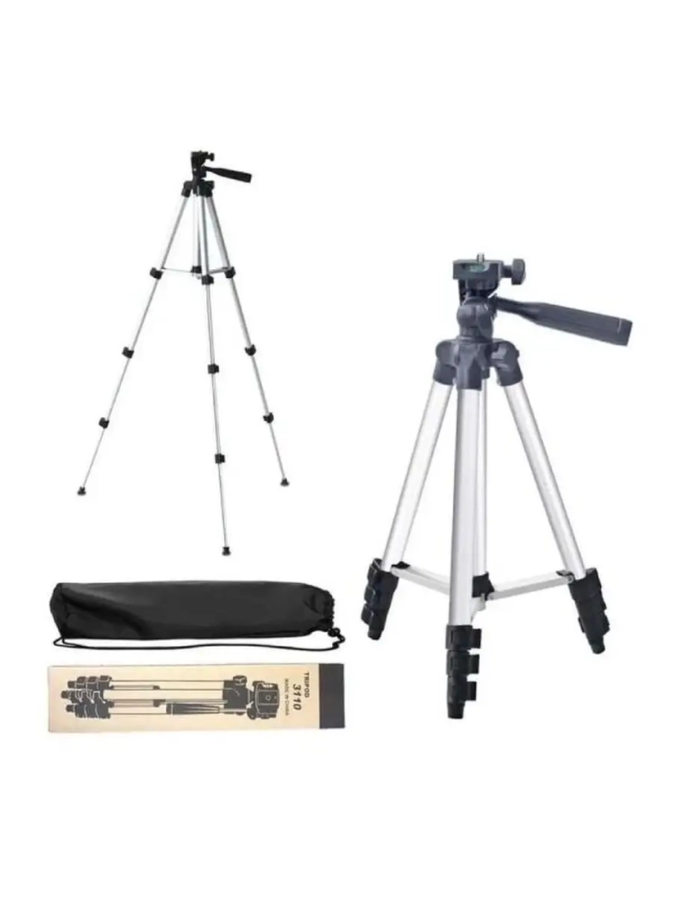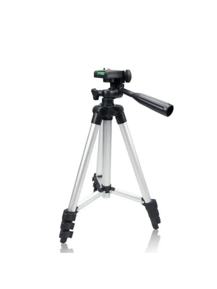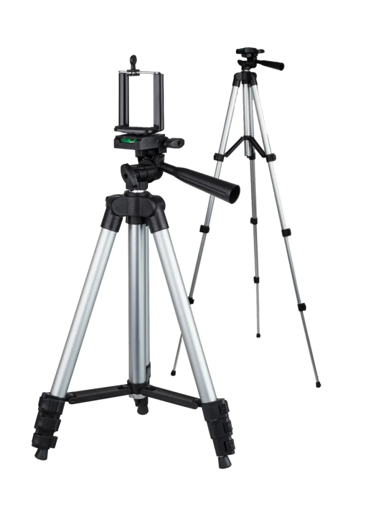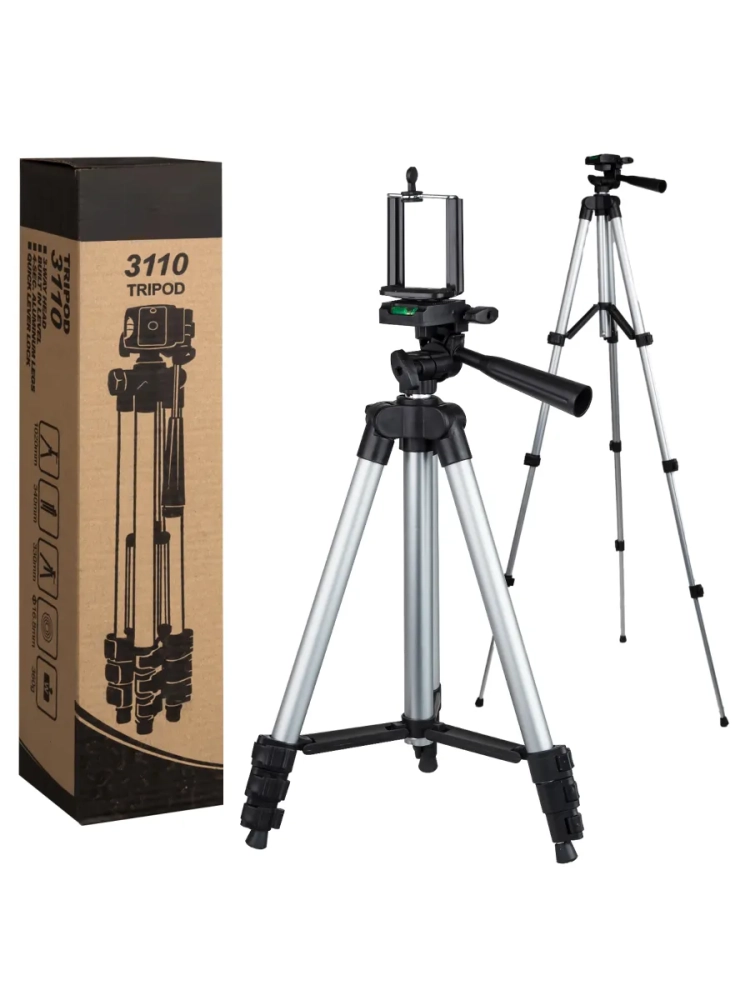 Алюминиевый трипод штатив для смартфона, фото и видео техники 35-102см, с тремя секциями и уровнем, TRIPOD 3110. В комплекте с данным штативом идет крепление для телефона. Данное крепление фиксирует телефон в горизонтальном положении и позволяет использовать для съемок телефоны диагональю до 5,5 дюймов (ширина должна быть не более 8,5 см).Также в комплекте есть пульт (кнопка) для управления камерой телефона на расстоянии до 10 метров через Bluetooth. Больше нет необходимости упрашивать прохожих для того, что бы сделать снимок с друзьями, в кругу семьи или наедине с природой.Штатив TRIPOD 3110 изготовлен из легких металлов, что и обеспечивает небольшой вес изделия. Надежность и прочность конструкции при этом не пострадала. Штатив состоит из центральной колонны и трех секционных опорных ножек. Несмотря на кажущуюся простоту конструкции штатив обладает высокой функциональностью.Конструкция штатива позволяет работать с фотоаппаратом или видеокамерой весом до 3 кг. Однако для максимальной комфортной работы лучше использовать видеокамеры и фотоаппараты весом около полутора кг.Штатив оснащен прорезиненными наконечниками на ножках, даже на скользких поверхностях тринога остается устойчивой. Все соединительные элементы работают четко и плавно. Оперативно подготовить штатив к работе можно буквально за несколько секунд.Пузырьковый уровень позволит точно установить триногу даже на не очень ровных поверхностях, а фиксирующие ручки расположены таким образом, что до каждой из них можно добраться, не отрывая руку от штатива, срабатывают они буквально мгновенно.
