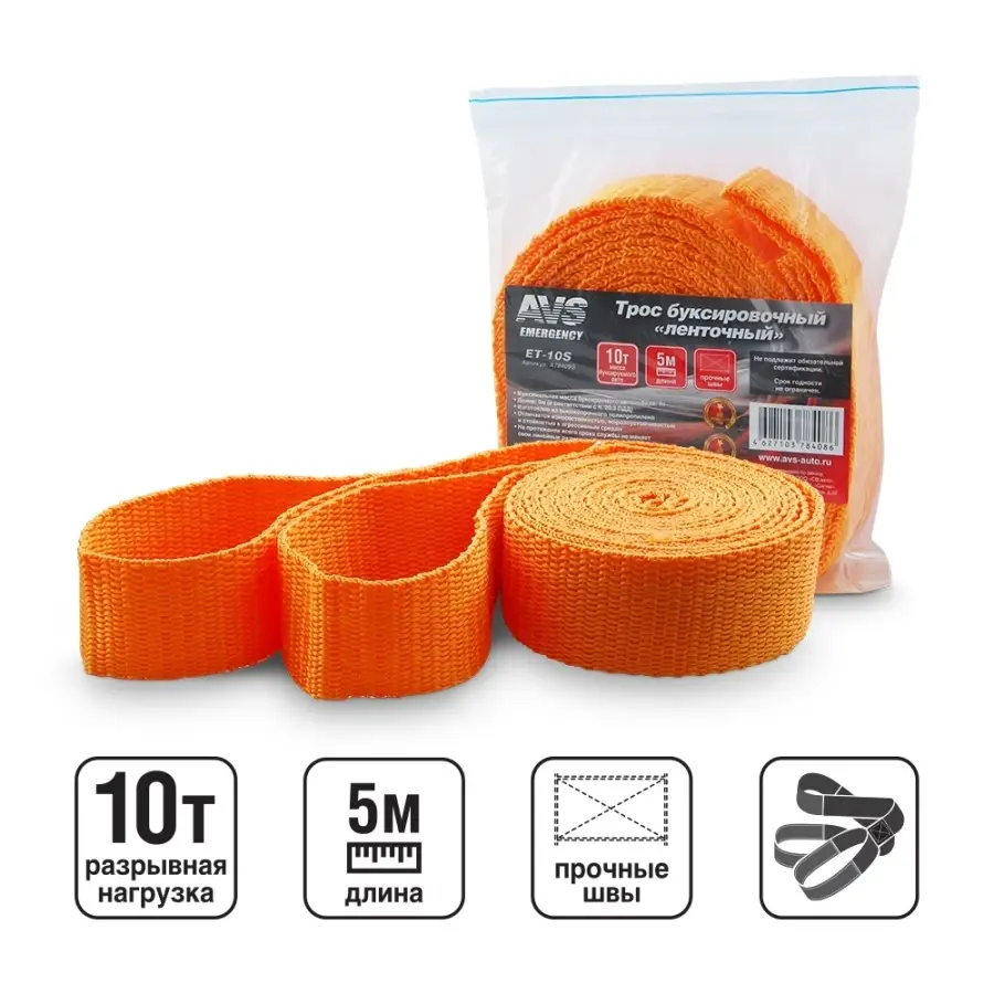 Трос буксировочный без крюков AVS ET-10S 10т 5м, в пакете