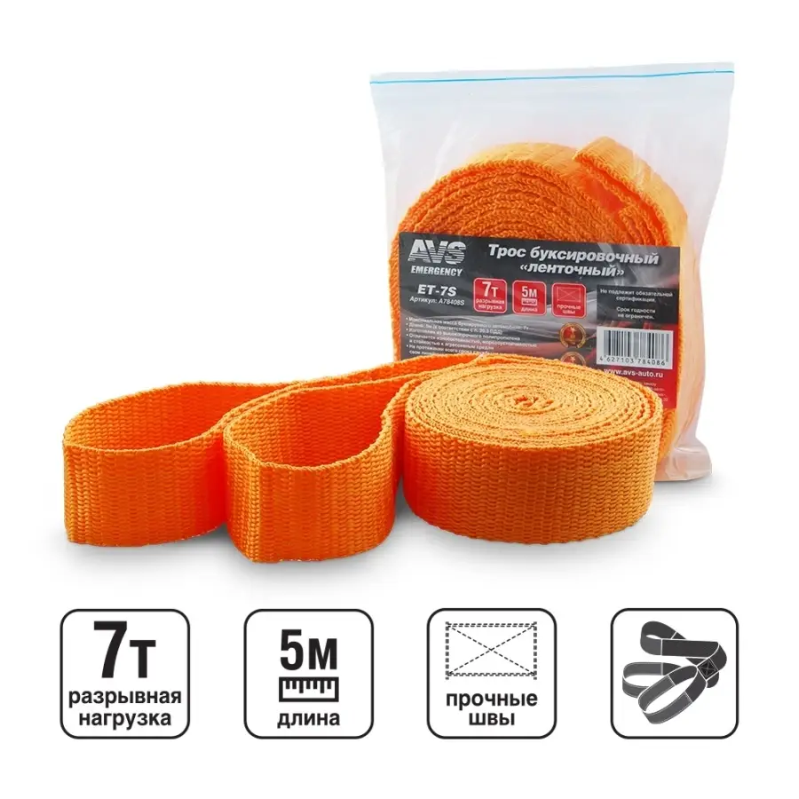 Трос буксировочный без крюков AVS ET-7S 7т 5м, в пакете
