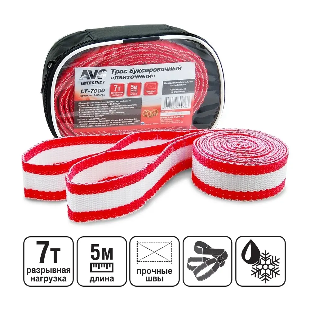 Трос буксировочный без крюков AVS LT-7000 7т 5м, в сумке