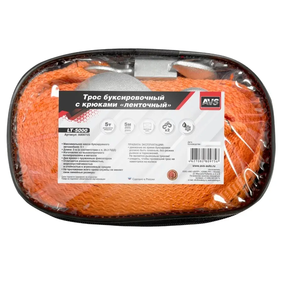 Трос буксировочный с крюками AVS LT-5000 5т 5м, в сумке