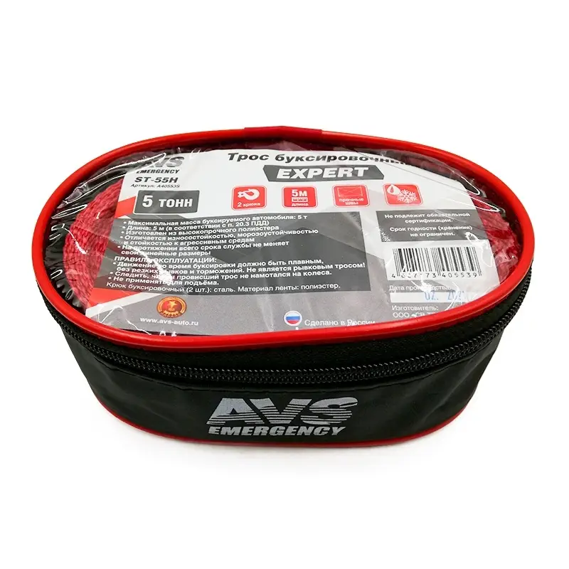Трос буксировочный (усиленный) AVS EXPERT ST-55H 5т 5м.крюки (сумка)