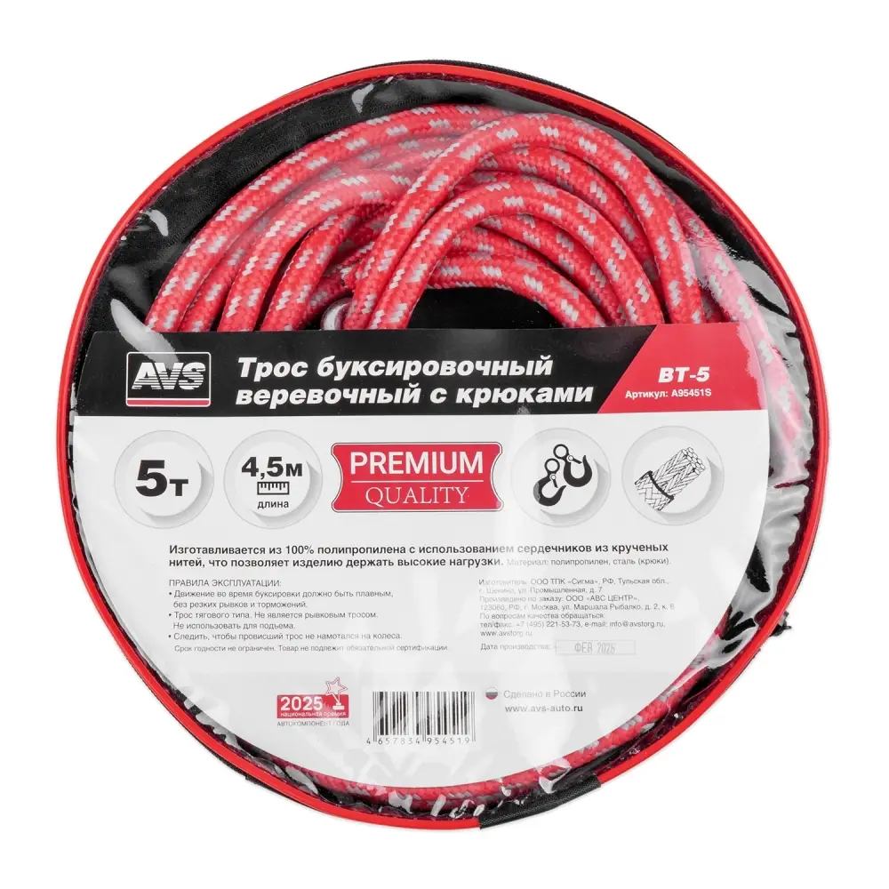 Трос буксировочный веревочный с крюками 5т 4,5м AVS BT-5 в сумке
