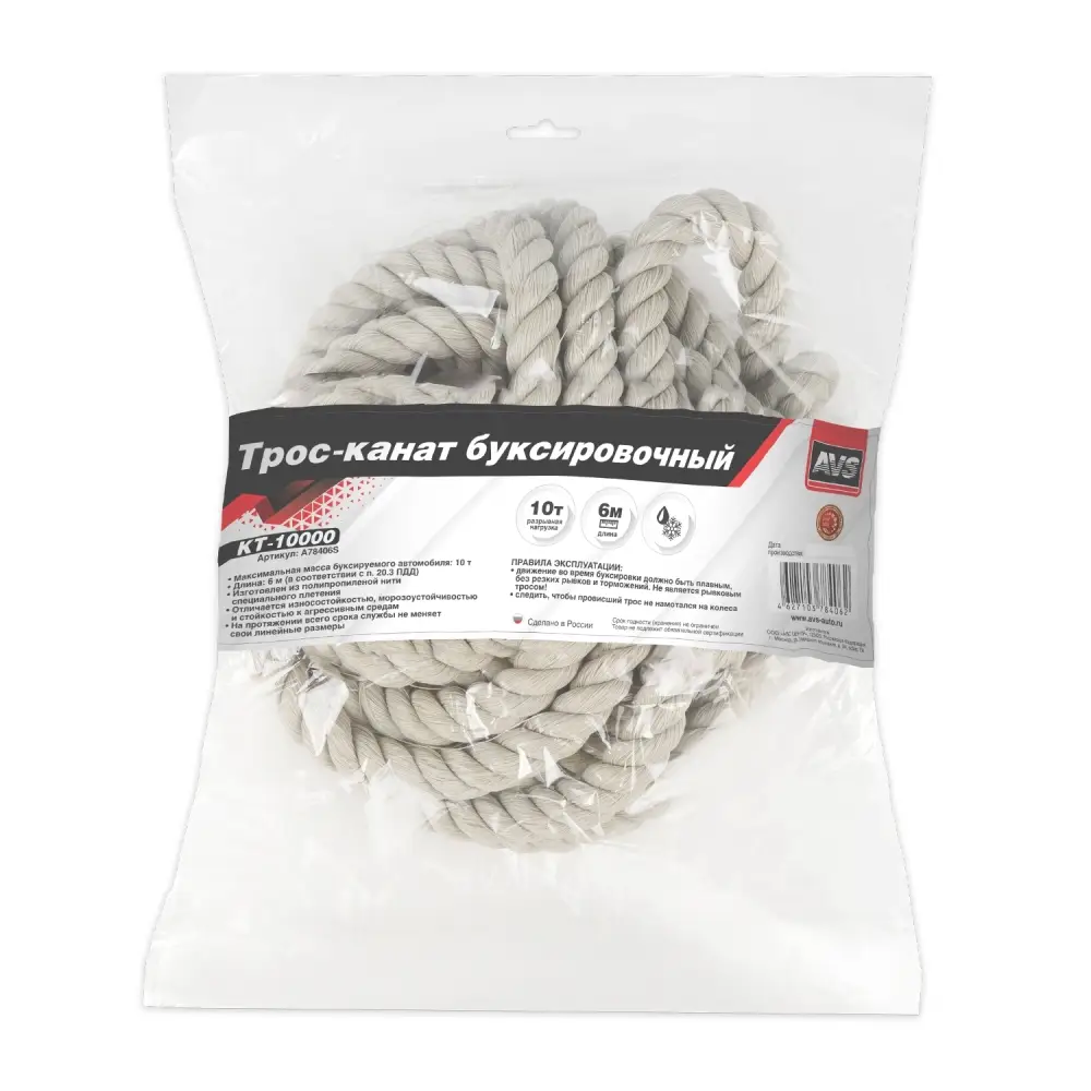 Трос-канат буксировочный без крюков AVS KT-10000 10т 6м, в пакете