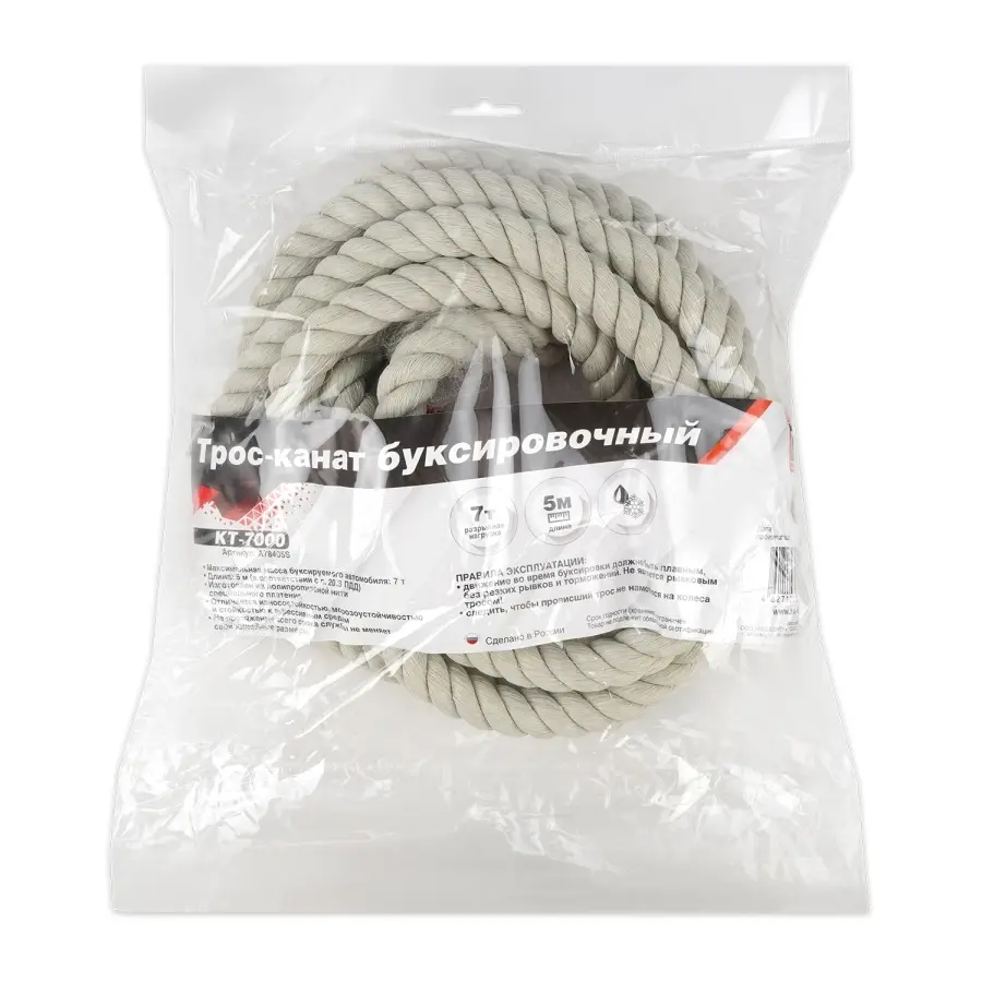 Трос-канат буксировочный без крюков AVS KT-7000 7т 5м, в пакете