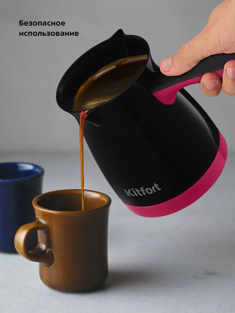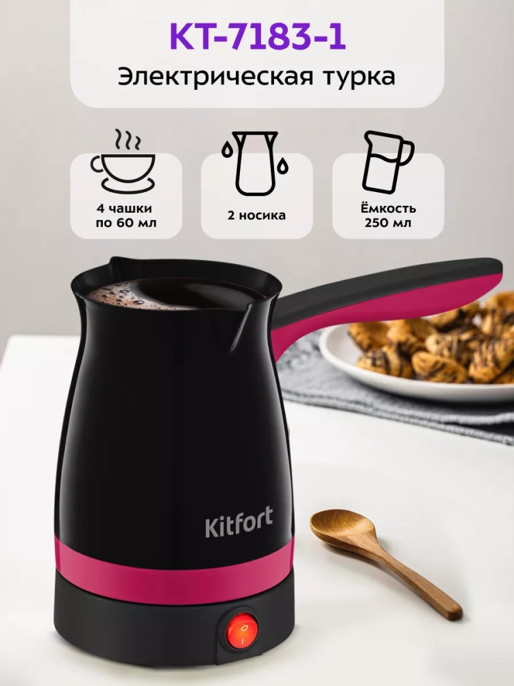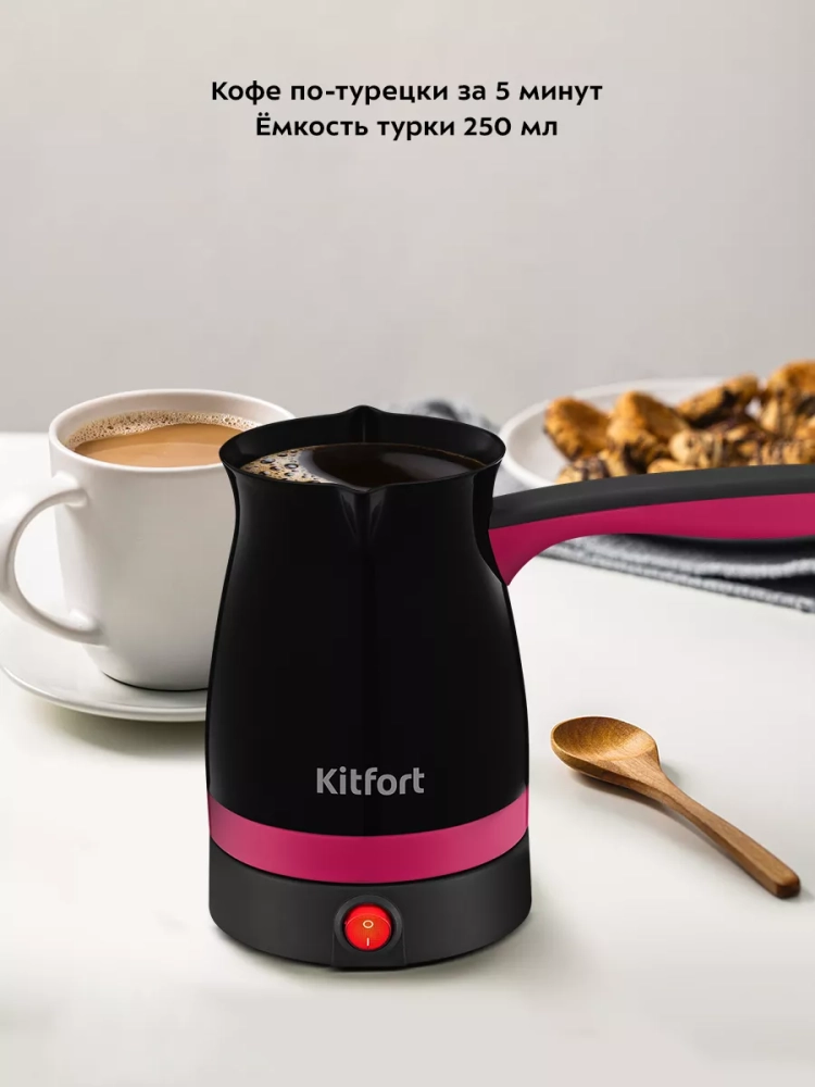 Электрическая турка Kitfort КТ-7183 варит кофе по-турецки. С ней вы сможете быстро и легко сварить натуральный кофе на 4 чашки по 60 мл. Устройство состоит из базы и турки.