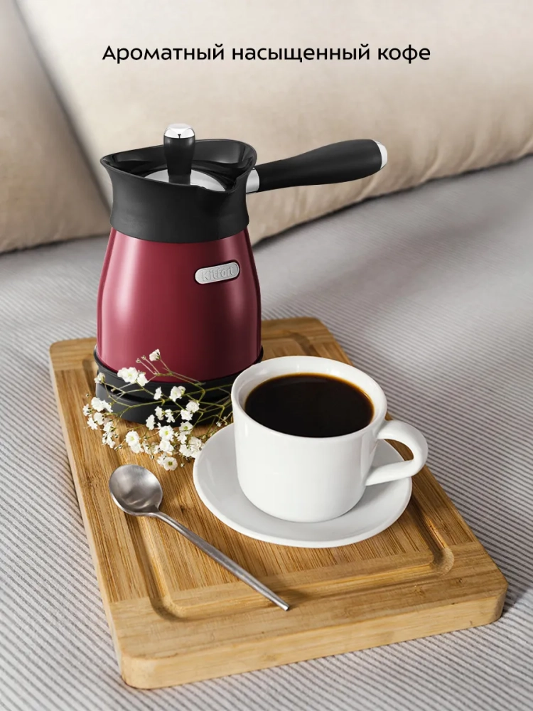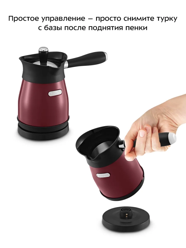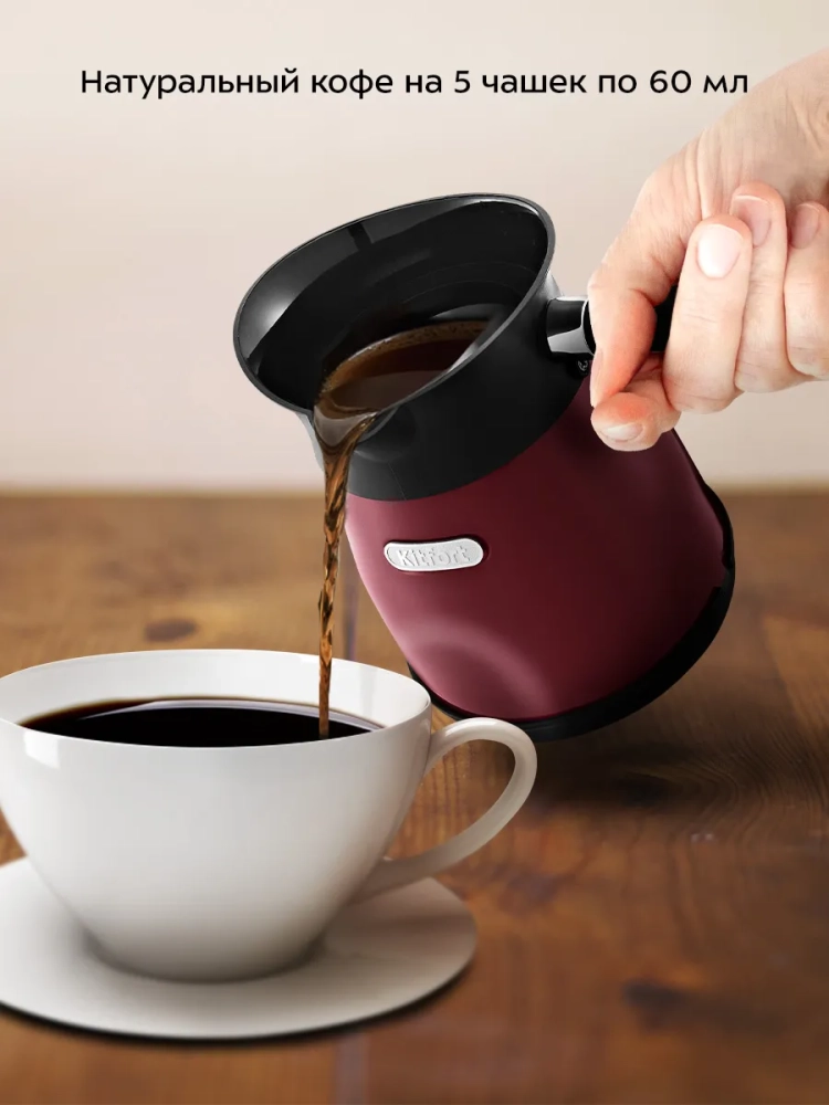 Электрическая турка Kitfort КТ-7499 варит кофе по-турецки. С ней вы сможете быстро и легко сварить натуральный кофе на 5 чашек по 60 мл. Устройство состоит из базы и турки.
