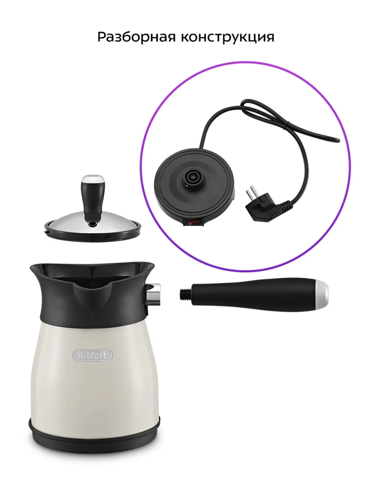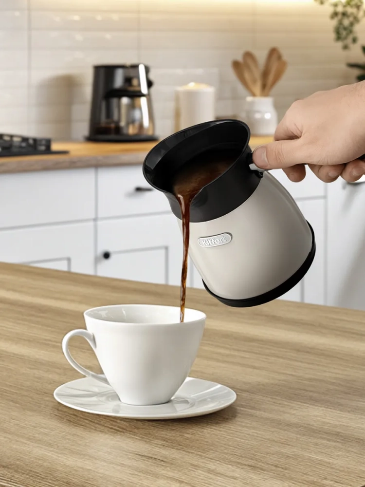 Электрическая турка Kitfort КТ-7501 варит кофе по-турецки. С ней вы сможете быстро и легко сварить натуральный кофе на 5 чашек по 60 мл. Устройство состоит из базы и турки.