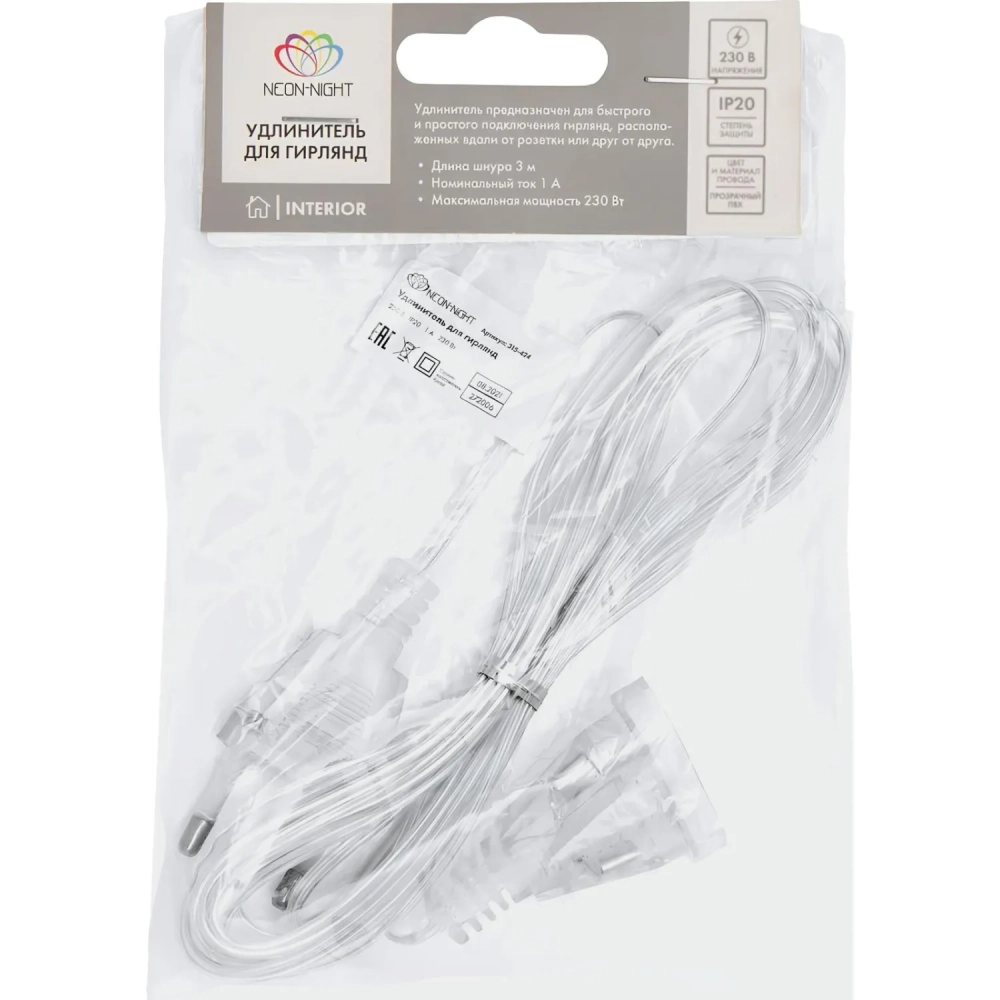 Удлинитель для домашних гирлянд 3 м, прозрачный ПВХ 315-424