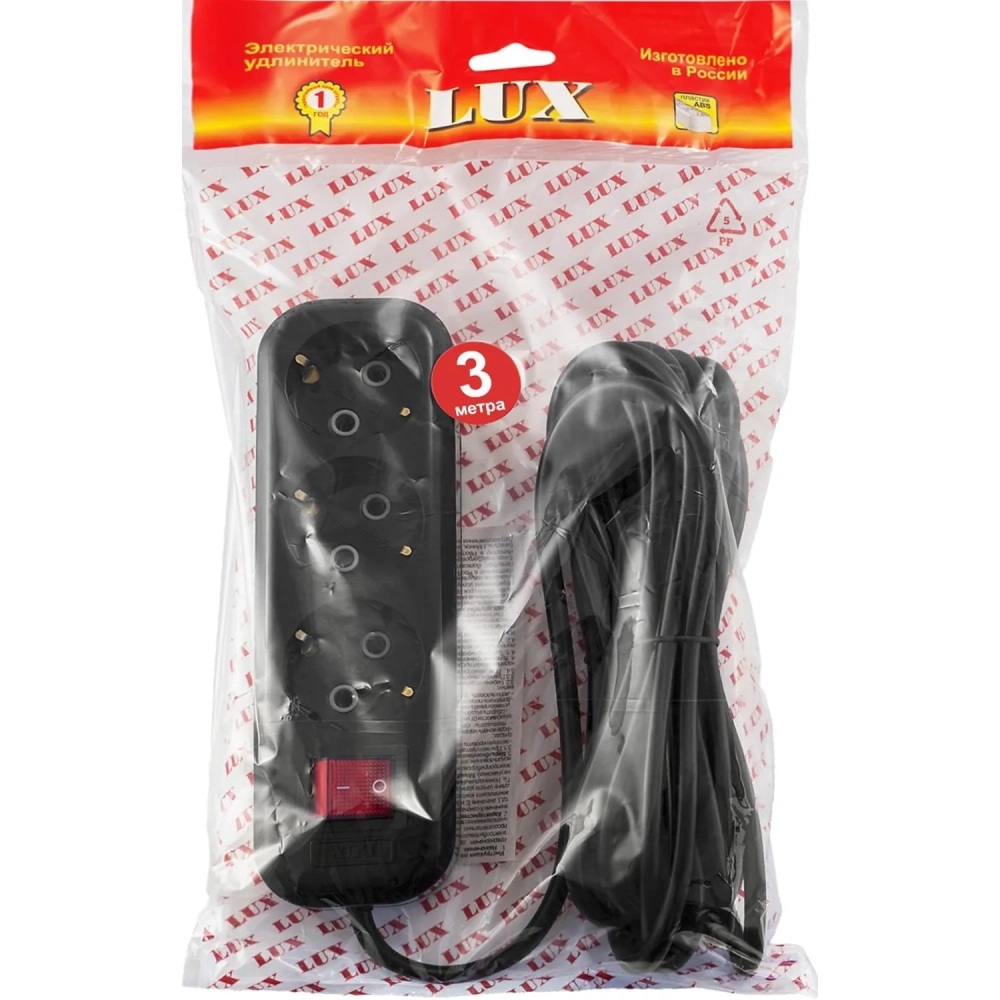 Удлинитель LUX У3-ЕВК-03 с выкл. 3-мест с з/к, 250В 16А, 3м, черный