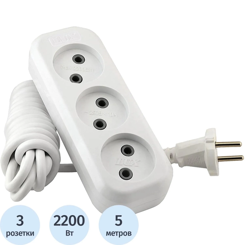 Удлинитель LUX У3-О-05 3 входа 5м без заземления, 250В, 10А