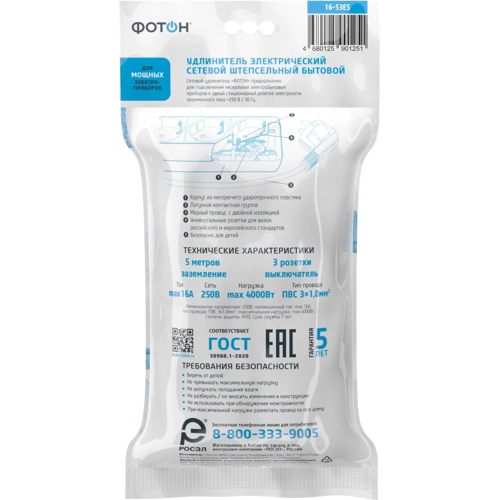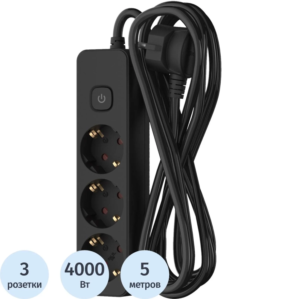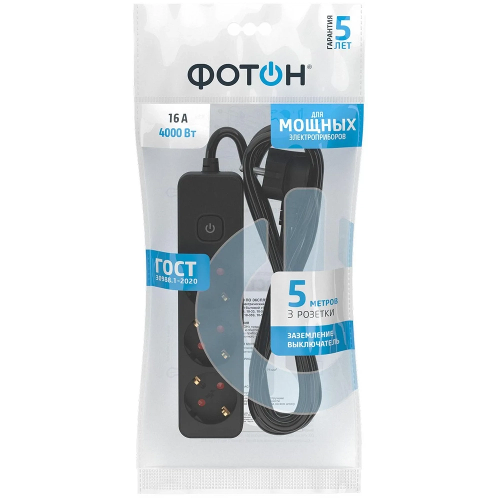 Удлинитель сетевой ФОТОН 16-53ЕS, 5м, 3 р, 16А, с выкл., с заземл., Черный
