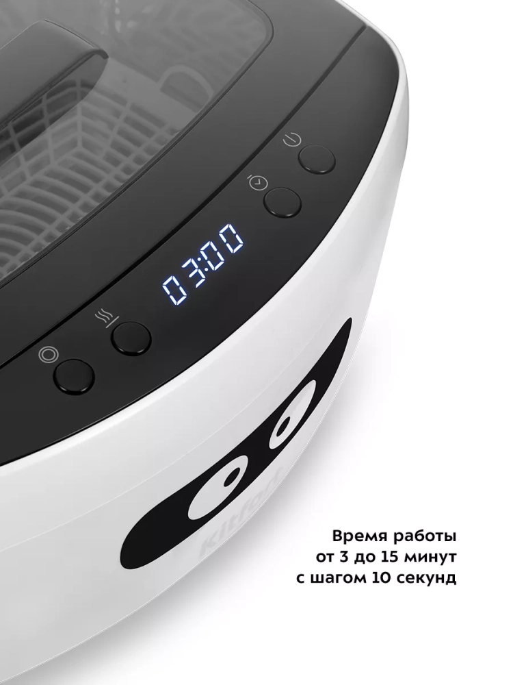 Управление прибором осуществляется при помощи кнопок на панели управления. Вы можете выбрать время работы от 3 до 15 минут с шагом 10 секунд, после которого мойка автоматически отключается. Во время работы на дисплее отображается оставшееся время работы. Также можно включить нагрев во время чистки, или не включая очистку.