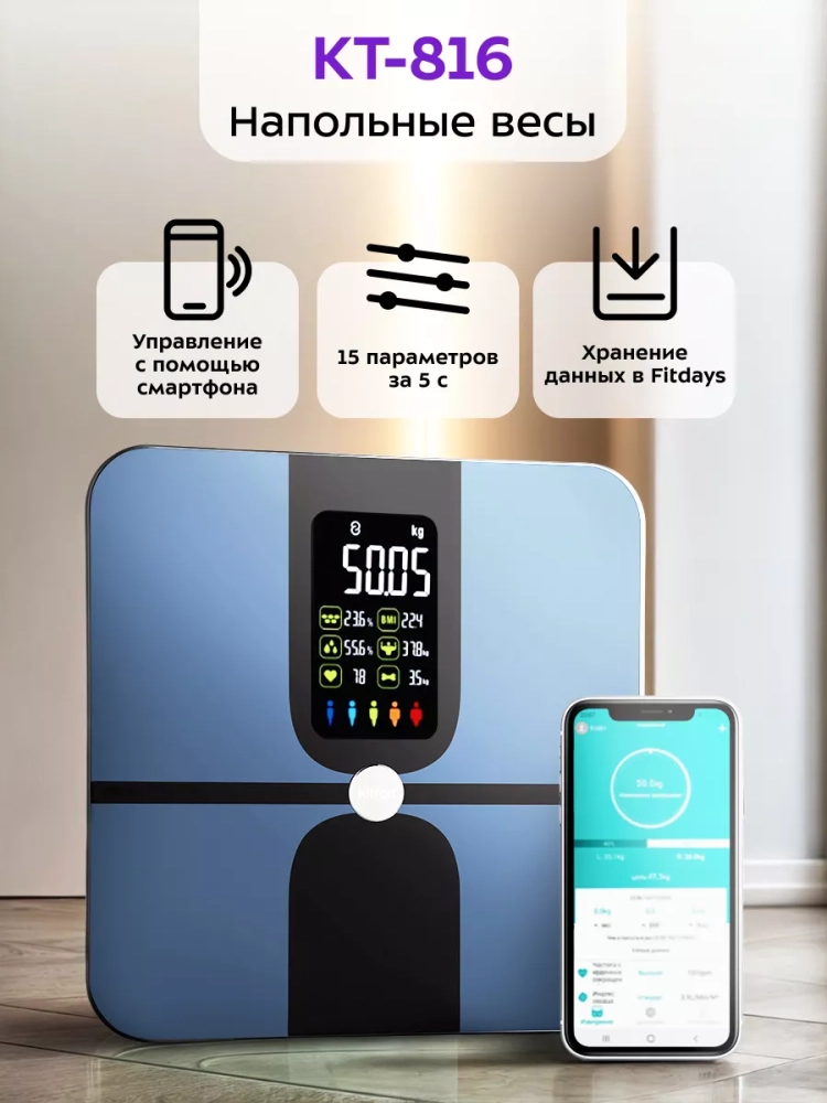 Электронные напольные весы обеспечивают высокую точность измерения, что очень важно людям, следящим за своим весом. Весы Kitfort КТ-816 представляют современное поколение «умных» весов, поскольку их можно подключить к приложению Fitdays, включив передачу данных через Bluetooth, которое выводит на экран телефона разные параметры биоимпедансного анализа: вес, индекс массы тела, мышечную массу, костную массу, процентное содержание воды и жира в организме и т.д. Также эти параметры отображаются на дисплее весов и без использования приложения, что очень удобно.