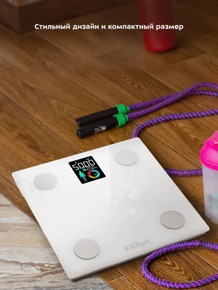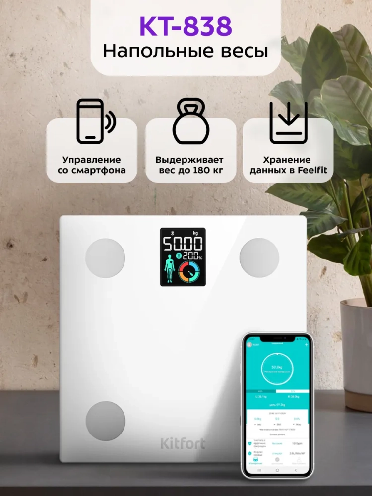 Электронные напольные весы обеспечивают высокую точность измерения, что очень важно людям, следящим за своим весом. Весы Kitfort КТ-838 представляют современное поколение «умных» весов, поскольку их можно подключить к приложению Feelfit, включив передачу данных через Bluetooth. Приложение выводит на экран телефона разные параметры биоимпедансного анализа: индекс массы тела, мышечную массу, процентное содержание воды и жира в организме и т.д.