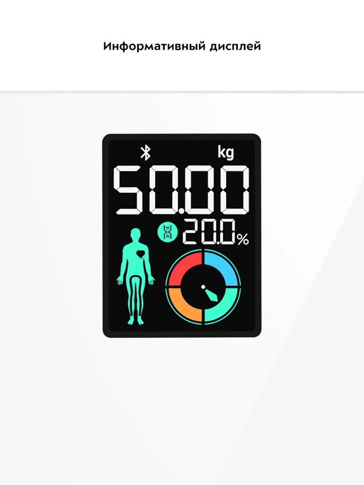 Весы оснащены жидкокристаллическим дисплеем с крупным отображением цифр, что делает их использование максимально удобным. Платформа выполнена из высокопрочного полированного стекла, а прорезиненные ножки обеспечивают дополнительную устойчивость весам и предотвращают их скольжение по полу, что гарантирует безопасность во время взвешивания. Токопроводящие электроды вмонтированы в платформу, они необходимы для проведения биоимпедансного анализа.