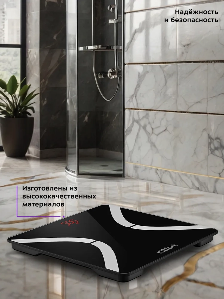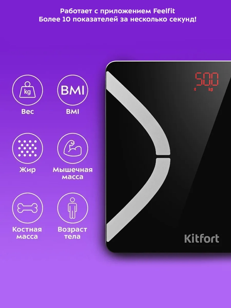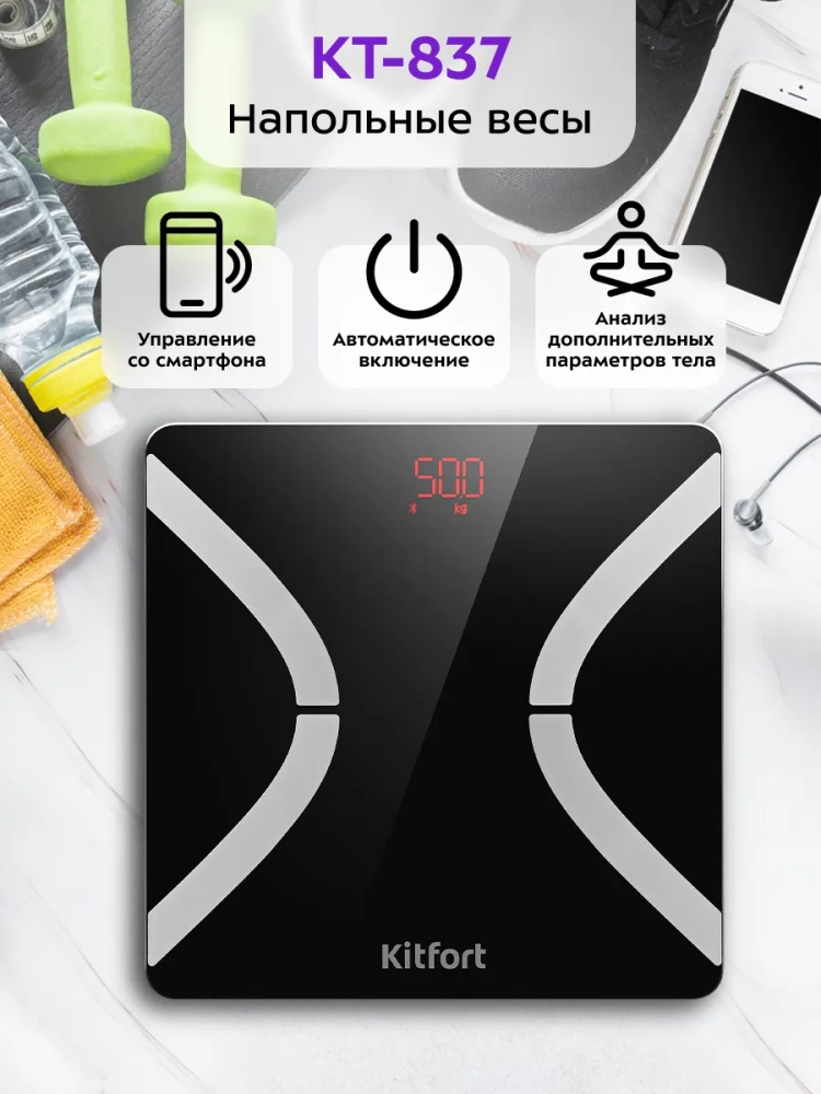 Электронные напольные весы обеспечивают высокую точность измерения, что очень важно людям, следящим за своим весом. Весы Kitfort КТ-837 представляют современное поколение «умных» весов, поскольку их можно подключить к приложению Feelfit, включив передачу данных через Bluetooth. Приложение выводит на экран телефона разные параметры биоимпедансного анализа: индекс массы тела, мышечную массу, процентное содержание воды и жира в организме и т.д.