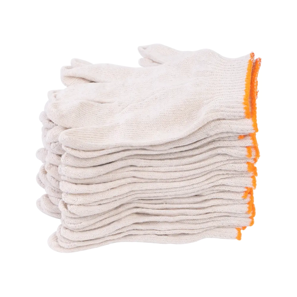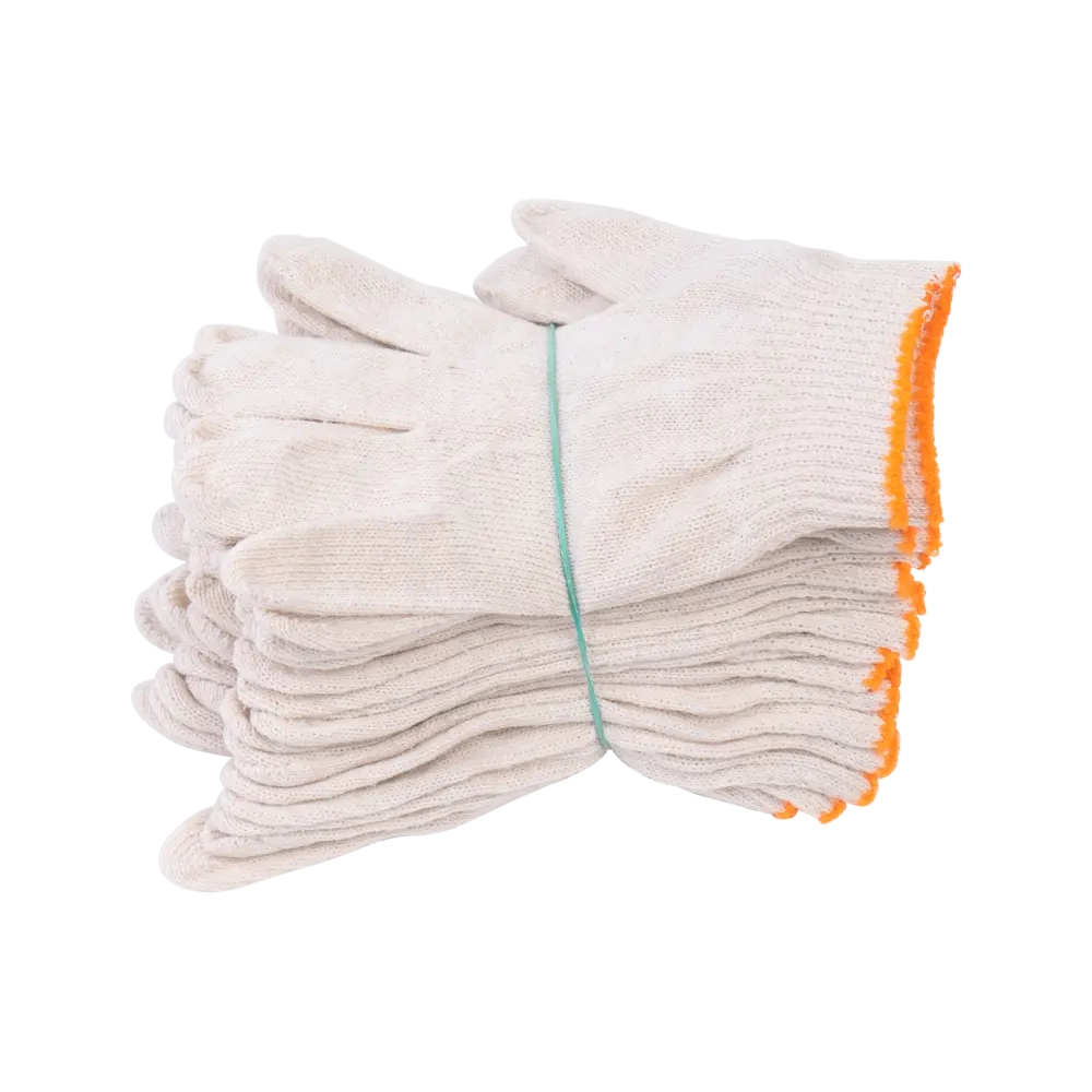 Упаковка Перчатки (10 пар) Небольших травм и мелких повреждений при выполнении физической работы просто не избежать. Хлопчатобумажные перчатки на «отлично» справляются со своей основной функцией – эффективно защищать руки от порезов, ссадин, заноз. Используются в строительной, хозяйственной, столярной, слесарной и других областях. Перчатки обеспечивают воздухообмен во время работы, поэтому в перчатках можно находиться продолжительное время. Отличаются стойкостью к истиранию, экологичностью, гипоаллергенностью.