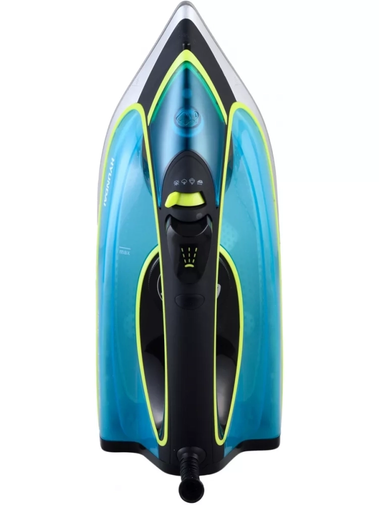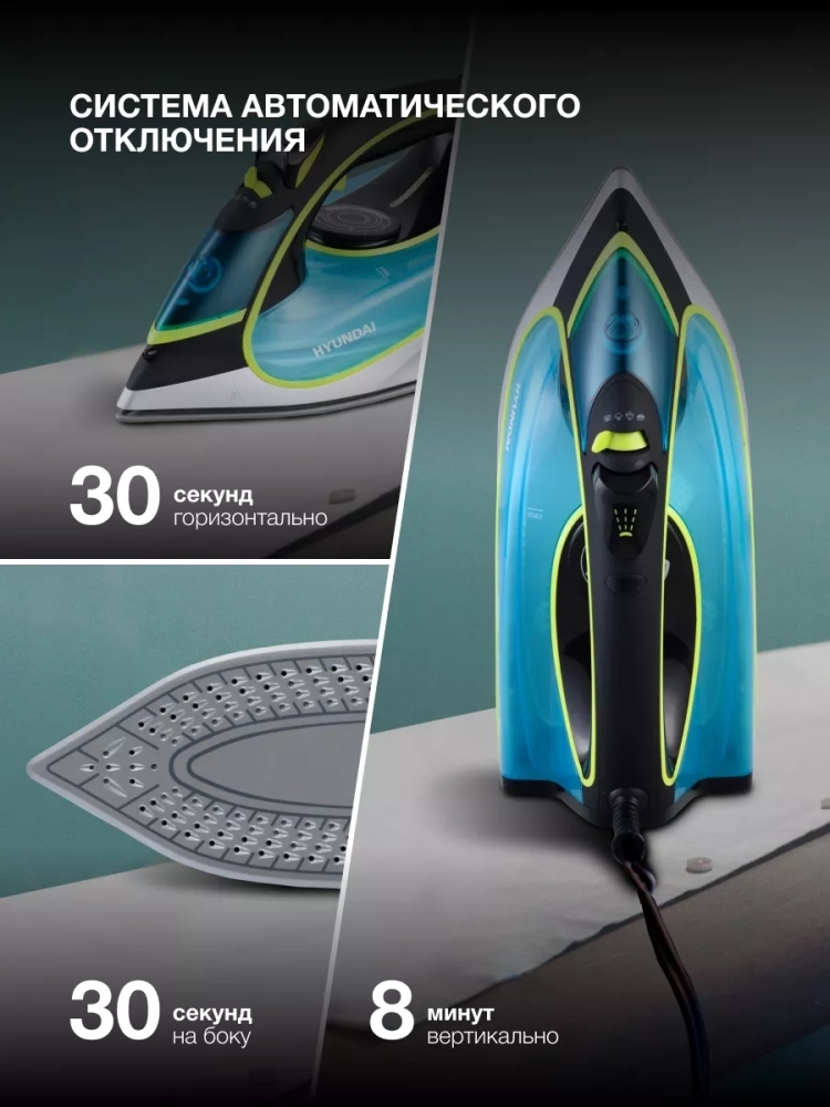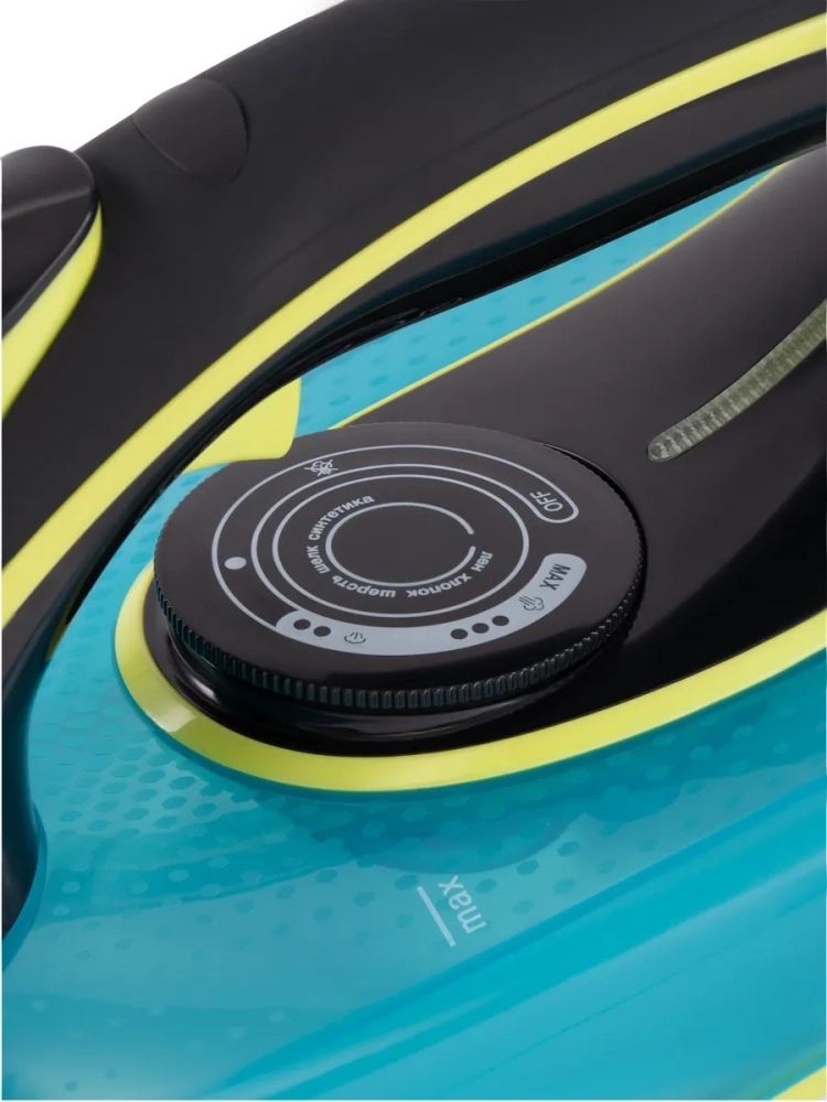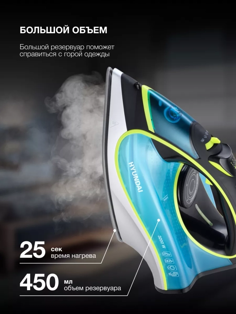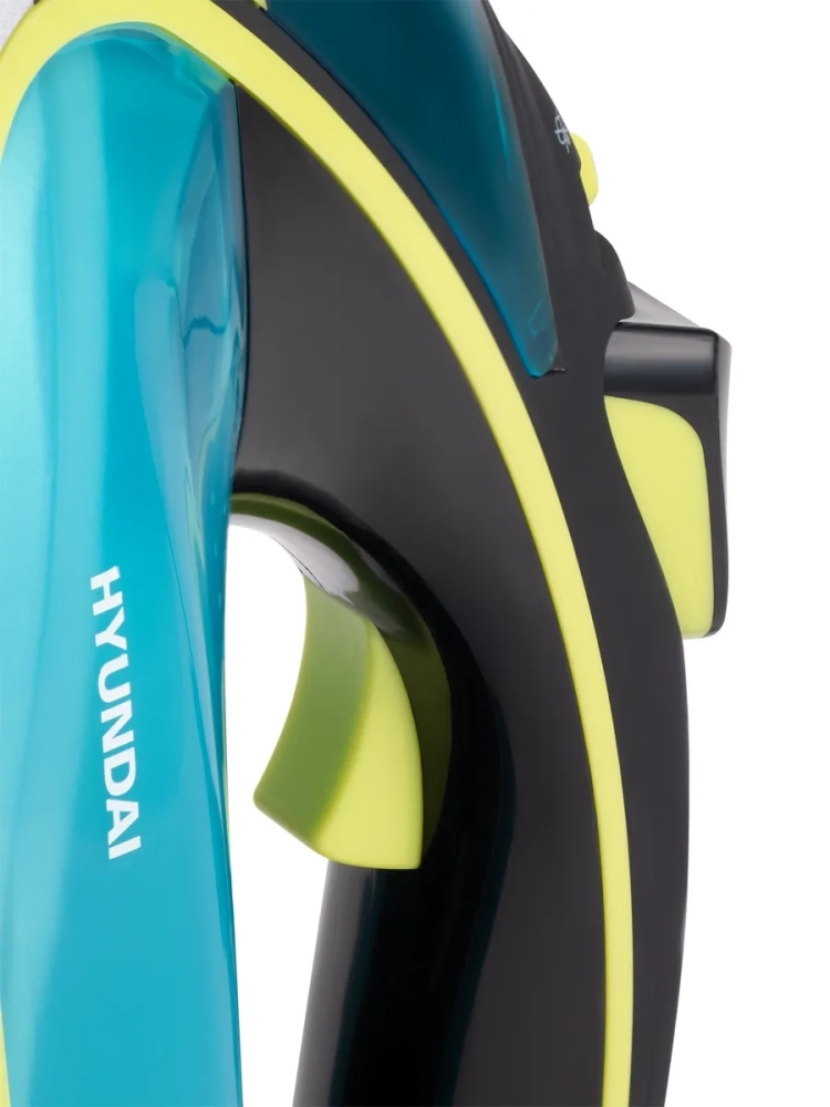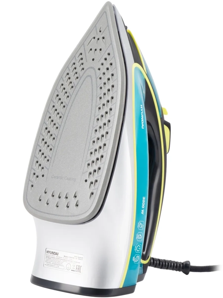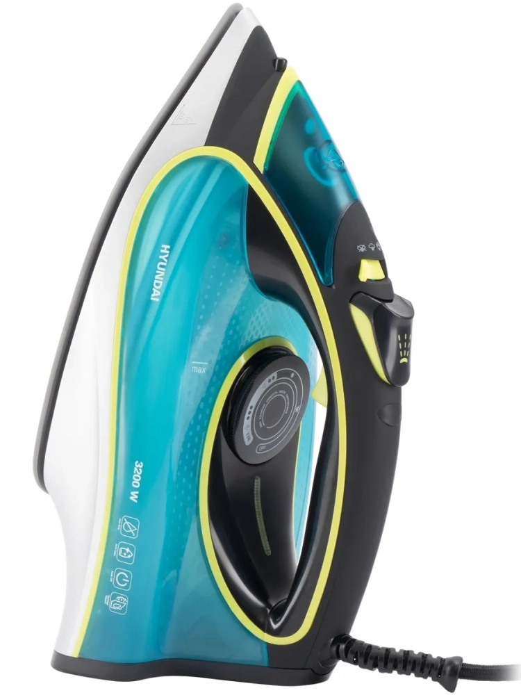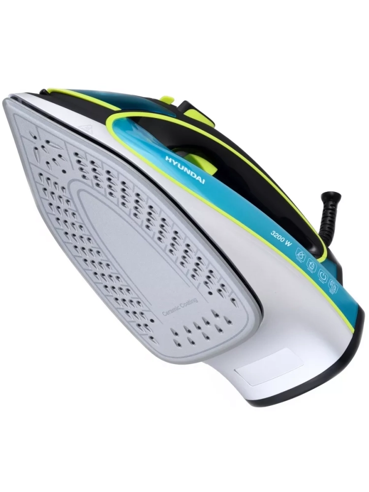 Утюг Hyundai H-SI01450 голубой/желтый, мощность 3200Вт, подошва утюга керамическая Enviro Ceramic, паровой удар 220г, емкость для воды 450мл, длина шнура 2м.