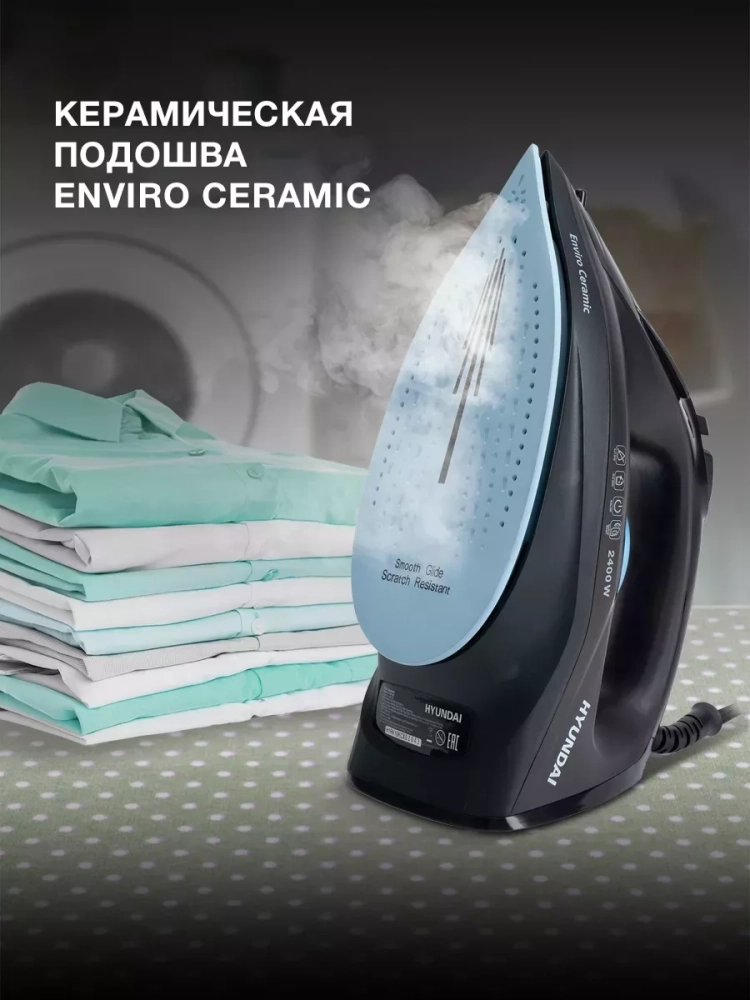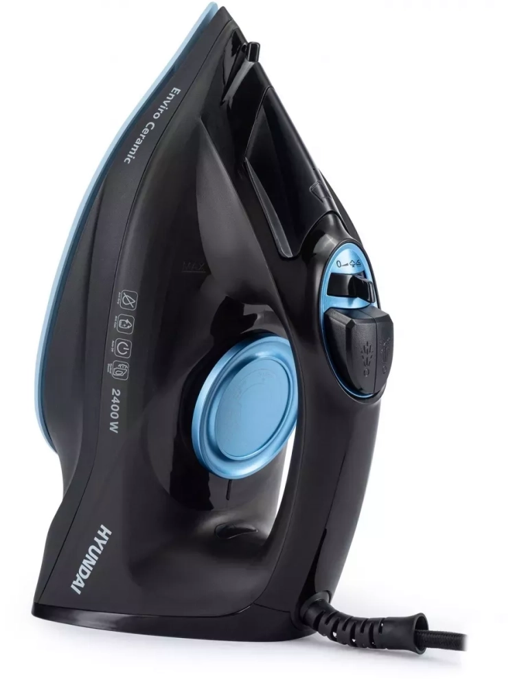 Утюг Hyundai H-SI01557 черный/голубой, мощность 2400Вт, подошва утюга керамическая Enviro Ceramic, паровой удар 160г, емкость для воды 250мл, длина шнура 2м.