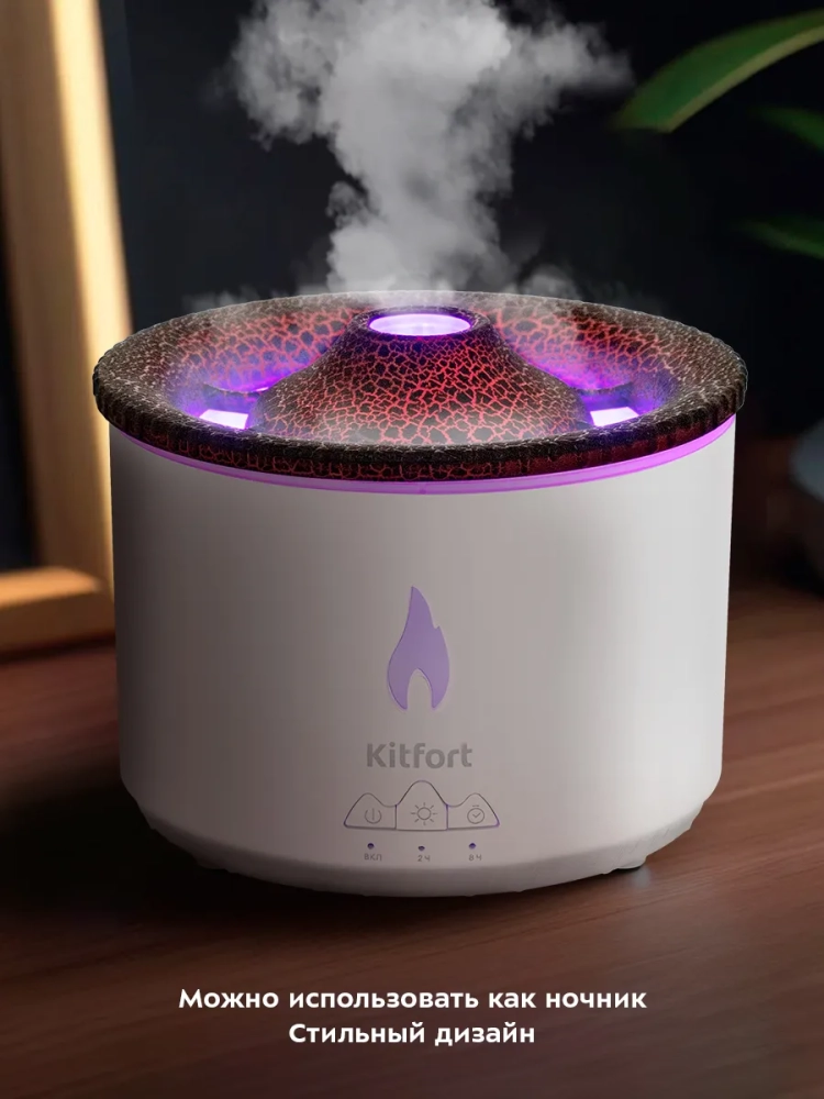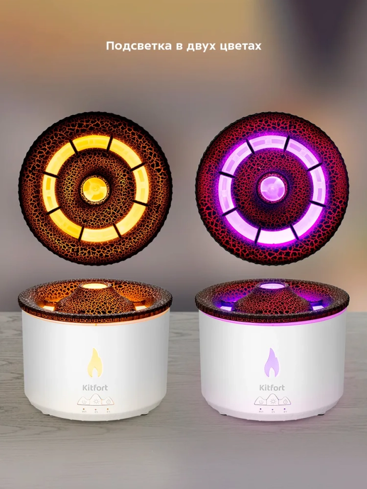 Благодаря подсветке и туману увлажнитель-ароматизатор при импульсной подаче тумана создает эффект вулкана, а при непрерывной подаче тумана — эффект пламени.