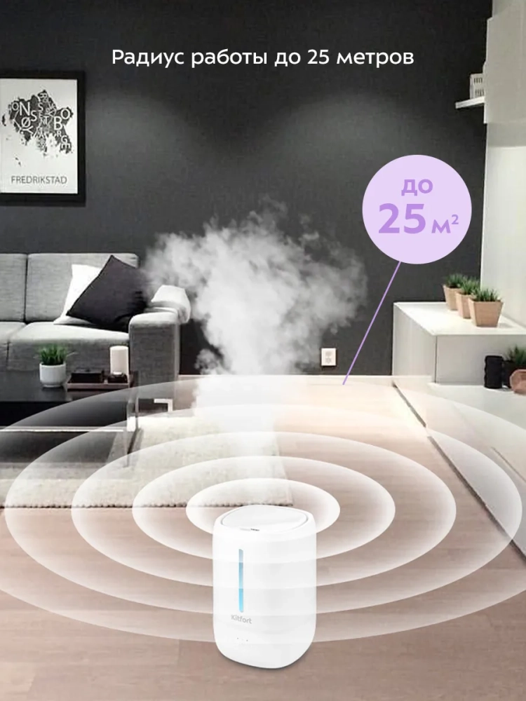 Ультразвуковой увлажнитель воздуха Kitfort KT-2831 увлажняет воздух в помещении, создавая хороший микроклимат для проживания людей. КТ-2831 простой в эксплуатации и обслуживании, отличается высокой надежностью в работе. Может использоваться в помещениях, площадь которых не превышает 25 кв. м. Данный увлажнитель компактный, прост как в использовании, так и в обслуживании. Ультразвуковые увлажнители считаются наиболее эффективными из существующих увлажнителей воздуха. Принцип работы такого увлажнителя прост. Внутри него стоит пьезокерамический излучатель, погруженный в воду, который с помощью ультразвуковых колебаний выбивает с поверхности воды мельчайшие капельки воды, создавая водяной туман. Этот туман выдувается наружу небольшим вентилятором, а затем разносится по объему помещения естественными воздушными потоками. Частицы тумана мелкие, они обладают большой суммарной поверхностью, а потому быстро испаряются, что приводит к повышению относительной влажности воздуха.
