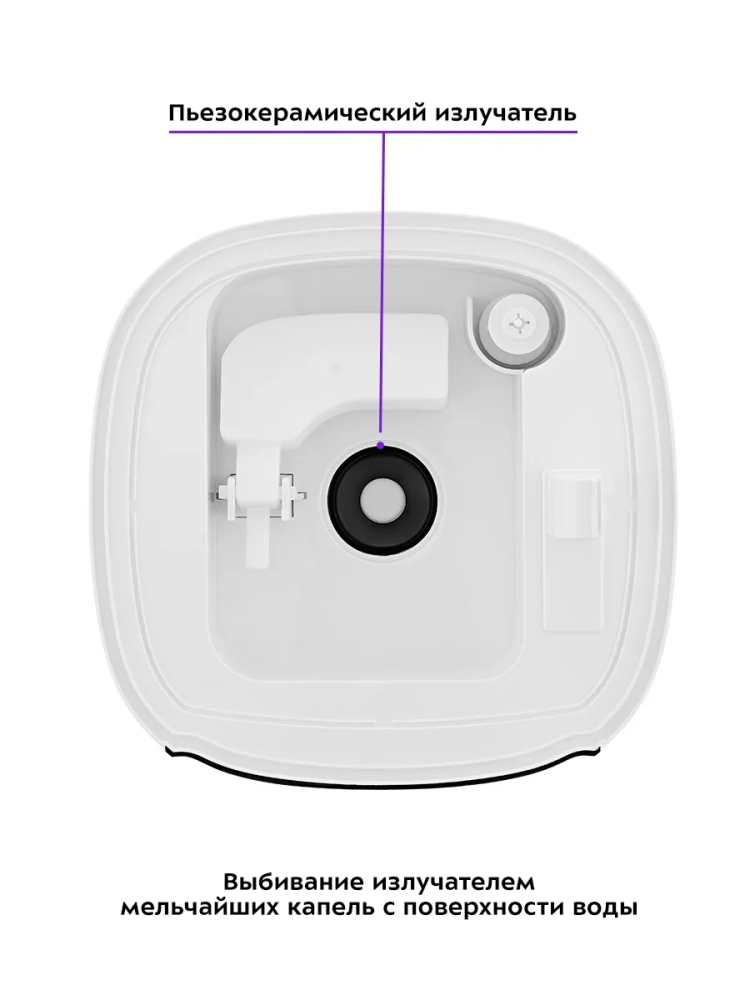 Ультразвуковые увлажнители считаются наиболее эффективными и безопасными из существующих увлажнителей воздуха. Принцип работы такого увлажнителя прост. Внутри него стоит пьезокерамический излучатель, погруженный в воду, который с помощью ультразвуковых колебаний выбивает с поверхности воды мельчайшие капли воды, создавая водяной туман. Этот туман выдувается наружу небольшим вентилятором, а затем разносится по объему помещения естественными воздушными потоками. Частицы тумана мелкие, они обладают большой суммарной поверхностью, а потому быстро испаряются, что приводит к повышению относительной влажности воздуха.