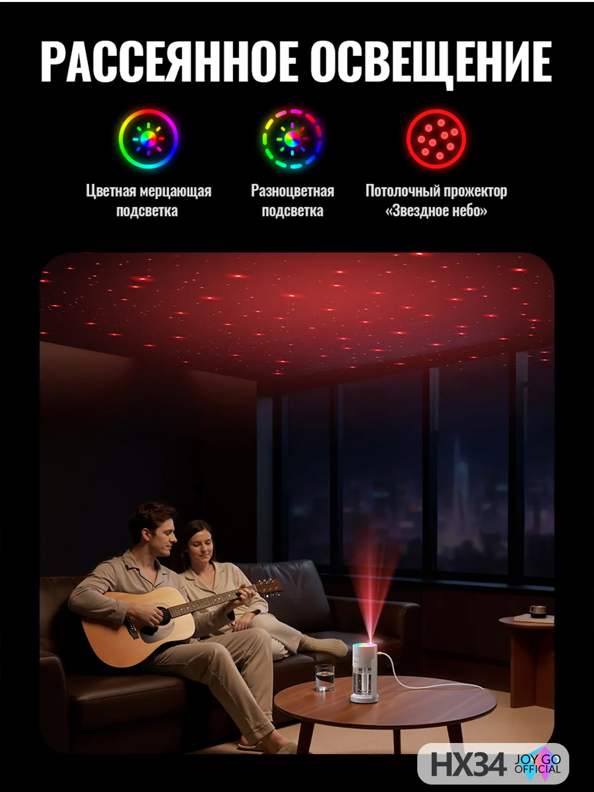 Мягкая разноцветная подсветка и проекция звездного неба создают уютную, романтическую или расслабляющую атмосферу. Идеально для вечернего отдыха, чтения или детского сна.