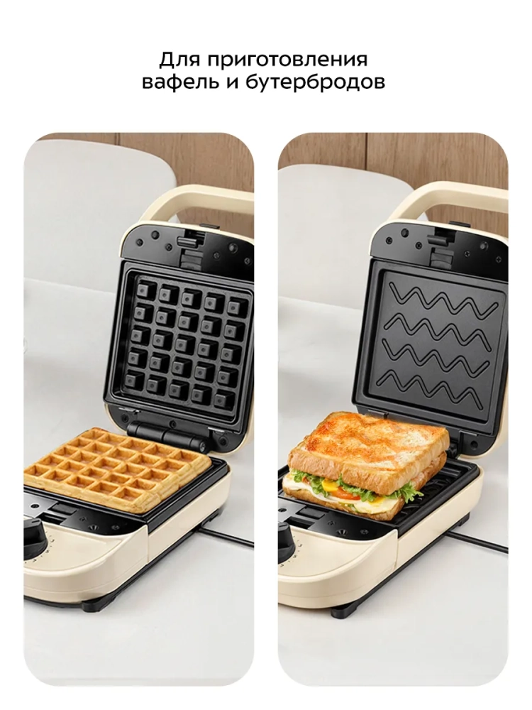 У прибора два вида панелей: пара панелей для приготовления вафель и пара панелей для приготовления бутербродов. Панели для бутербродов имеют специальную поверхность, чтобы тосты получались с узором. Высокая температура нагрева панелей способствует быстрому приготовлению продуктов. Для удобства ухода панели съемные — их можно мыть под проточной водой.