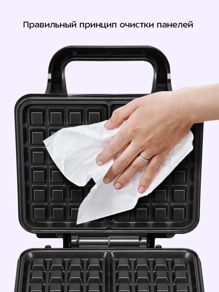 Антипригарное покрытие панелей не дает прилипнуть тесту в процессе приготовления и позволяет готовить с минимальным количеством масла или без него. Также антипригарное покрытие облегчает чистку панелей.