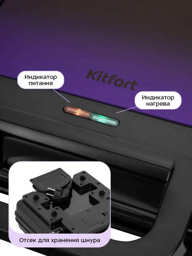 Вафельница оснащена индикаторами питания и нагрева, а также термостатом для поддержания температуры панелей.