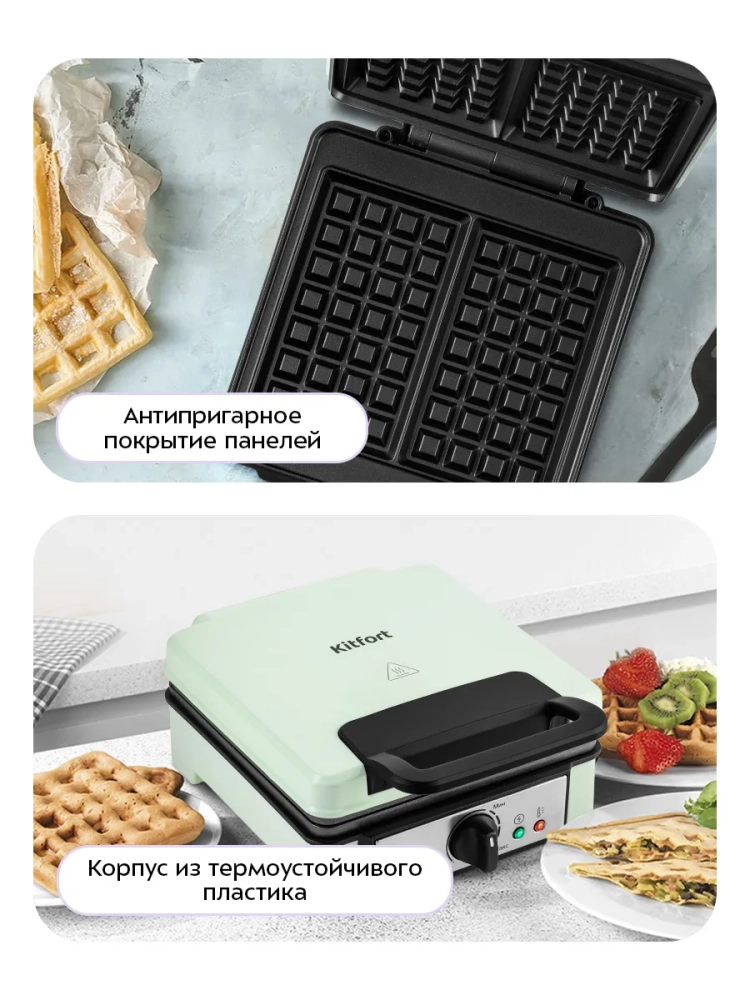 Идеальный подарок на любой случай: на Новый год, 23 февраля, 8 марта, день рождения, свадьбу или юбилей! Эта электрическая вафельница имеет независимые нагреватели в каждой половинке формы, что способствует равномерному распределению тепла и качественному приготовлению ваших любимых десертов. Корпус прибора выполнен из термоустойчивого пластика, а антипригарное покрытие форм предотвращает прилипание теста, облегчая процесс готовки и ухода за устройством. На нижней части корпуса предусмотрено место для хранения шнура, что делает хранение прибора более удобным. Противоскользящие ножки обеспечивают устойчивость на любой поверхности во время работы устройства. Kitfort КТ-1693 — это не просто электровафельница; это надежный помощник на вашей кухне! Благодаря этому прибору вы сможете быстро приготовить как классические венские вафли, так и другие виды выпечки по вашему вкусу. Электрический прибор от Kitfort станет незаменимым элементом вашего кухонного арсенала.