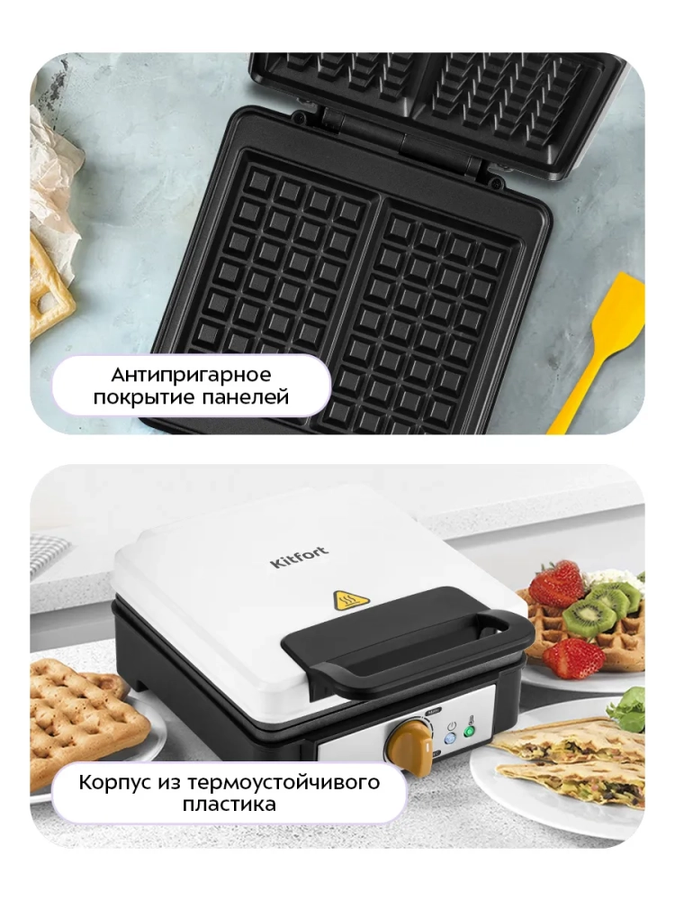 Электровафельница Kitfort оснащена интуитивно понятным управлением, что делает процесс приготовления вафель доступным даже для начинающих кулинаров. В комплект входит набор силиконовых лопаток, которые помогут аккуратно извлекать готовые вафли, не повреждая их форму. Это делает вафельницу Kitfort идеальным выбором для создания кулинарных шедевров на вашей кухне.