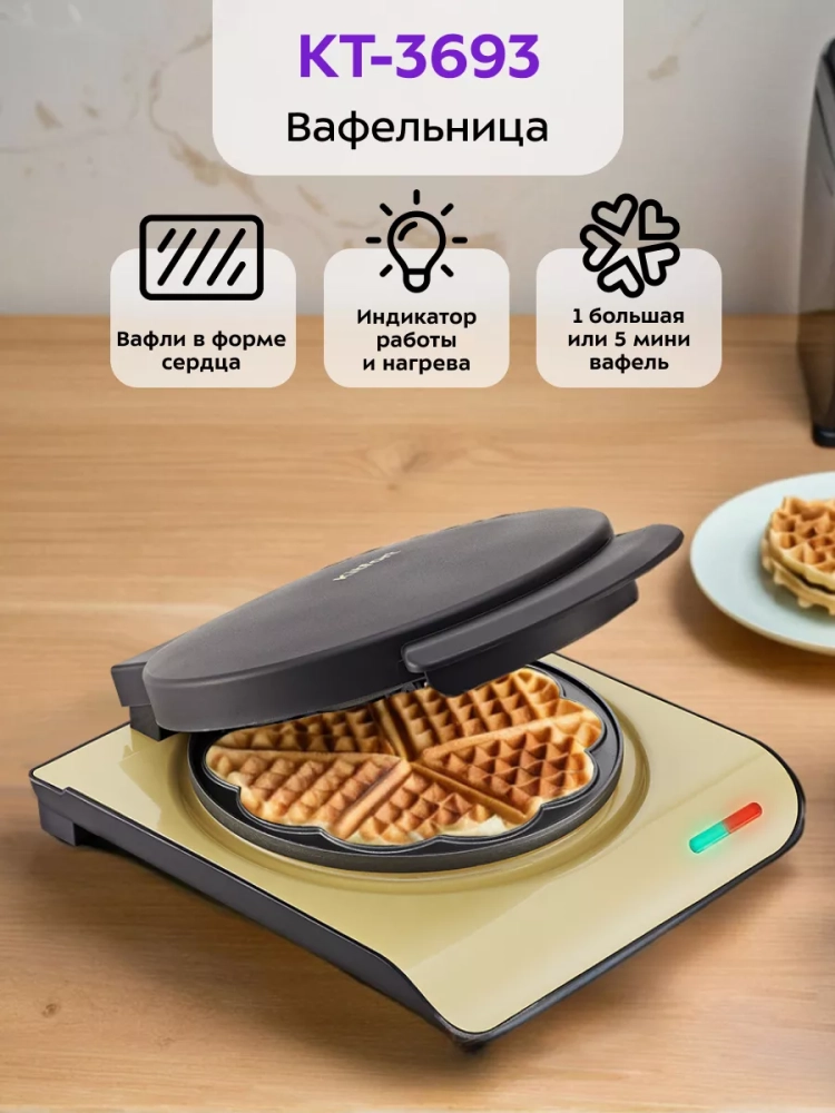 Антипригарное покрытие помогает не прилипать тесту в процессе приготовления и позволяет готовить с минимальным количеством масла или без него. Также антипригарное покрытие панелей облегчает чистку, что особенно важно, так как панели являются несъемными. Вафельница оснащена индикатором питания, термостатом для поддержания температуры панелей и индикатором нагрева, который покажет, когда панели разогреются. В вафельнице установлены нагреватели в каждой половине. Противоскользящие ножки не дают прибору скользить по столу во время готовки. Корпус выполнен из пластика. Ручка вафельницы KT-3693 не нагревается во время использования, что позволяет не пользоваться прихватками.