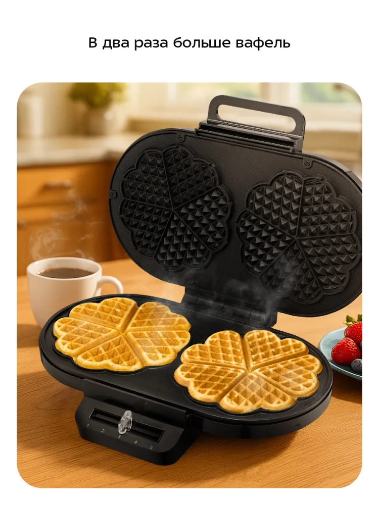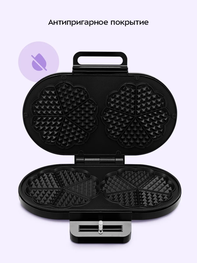 С помощью электрической вафельницы Kitfort КТ-4691 вы сможете испечь вафли в форме цветка, которые при желании можно разделить на сердечки. Вафельница рассчитана на приготовление 2 вафель в форме цветка или 10 маленьких вафель в форме сердечек.