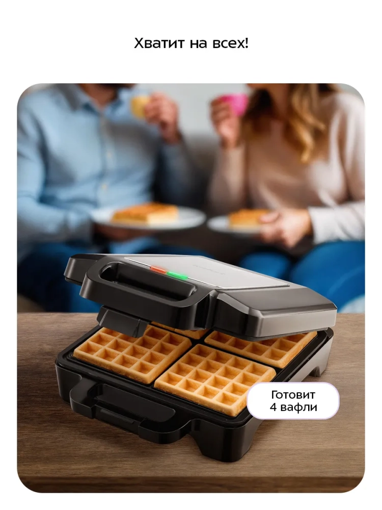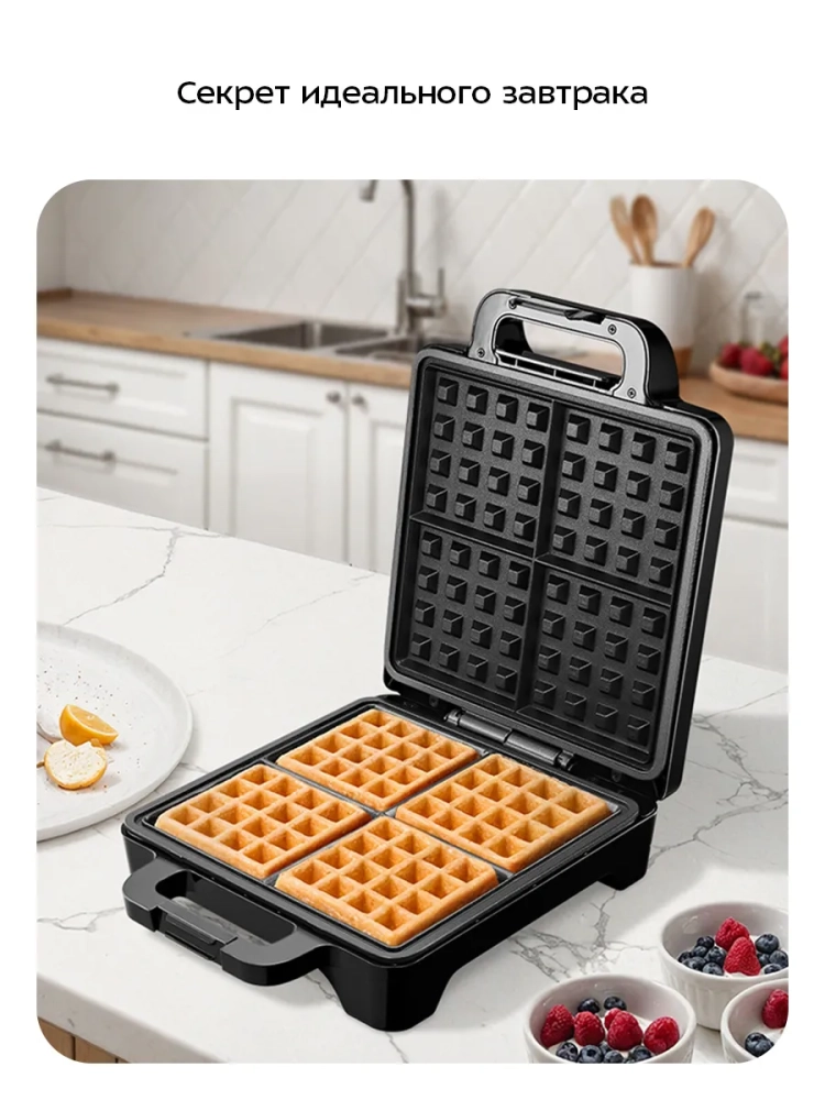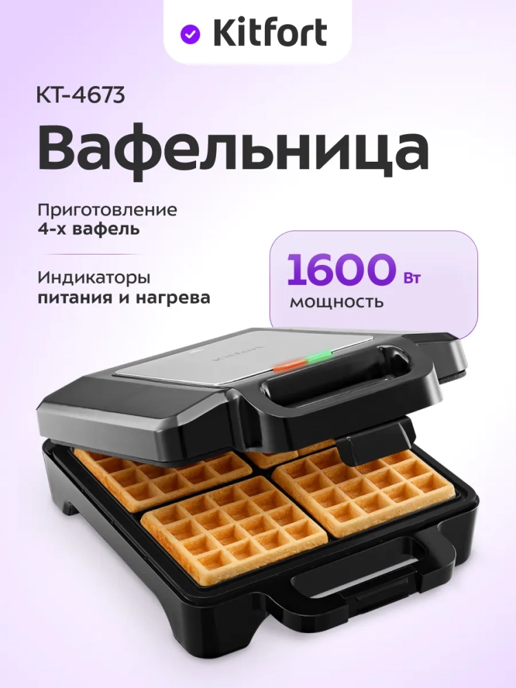Электрическая вафельница Kitfort КТ-4673 — это идеальное решение для любителей бельгийских вафель. С ее помощью вы сможете приготовить сразу 4 аппетитные вафли за один раз, что делает её отличным выбором для большой семьи или дружеской компании. Антипригарное покрытие панелей предотвращает прилипание теста, позволяя готовить с минимальным количеством масла и облегчая процесс чистки после использования. Вафельница оснащена индикаторами питания и нагрева, которые обеспечивают удобство в использовании и контроль над процессом приготовления. Встроенный термостат поддерживает оптимальную температуру панелей, гарантируя равномерное пропекание каждой вафли. Фиксатор крышки позволяет закрыть её полностью или оставить в приоткрытом положении для удобства. Эта модель работает от сети с напряжением ~220–240 В и частотой 50/60 Гц, потребляя мощность 1600 Вт. Она относится к классу защиты I от поражения электрическим током, что обеспечивает безопасность эксплуатации прибора. Длина шнура составляет 0,7 м — достаточно для комфортного размещения на кухне. Размеры панелей составляют 260 х 250 мм, а габариты устройства — 291 х 362 х 116 мм. Это компактная электровафельница легко найдет место на вашей кухне благодаря своему эргономичному дизайну. Вафельница Kitfort КТ-4673 станет незаменимым помощником в приготовлении вкусных домашних десертов без лишних хлопот! Если вы ищете надежную электровафельницу с современными функциями и стильным дизайном — эта бытовая модель китфорт именно то, что вам нужно.