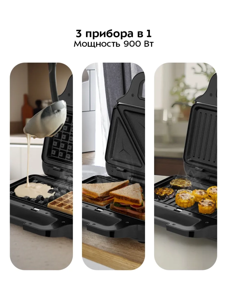 У прибора три пары панелей: панели для приготовления вафель, панели для приготовления бутербродов и ребристые панели для гриля. Высокая температура нагрева панелей способствует быстрому приготовлению продуктов. Для удобства ухода панели сделаны съемными — их можно мыть под проточной водой.