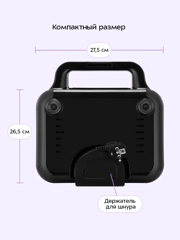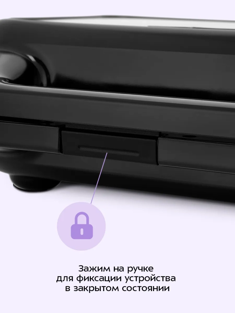 Вафельница оснащена термостатом для поддержания температуры панелей, а также индикаторами питания и нагрева. Держатель шнура на нижней части корпуса обеспечивает удобство хранения. Зажим на ручке удерживает крышку вафельницы в закрытом состоянии, что делает готовку, транспортировку и хранение более удобными.