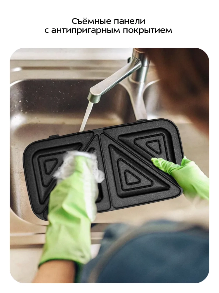 У прибора три пары панелей: панели для приготовления вафель, панели для приготовления бутербродов и ребристые панели для гриля. Высокая температура нагрева панелей способствует быстрому приготовлению продуктов. Для удобства ухода панели сделаны съемными — их можно мыть под проточной водой.
