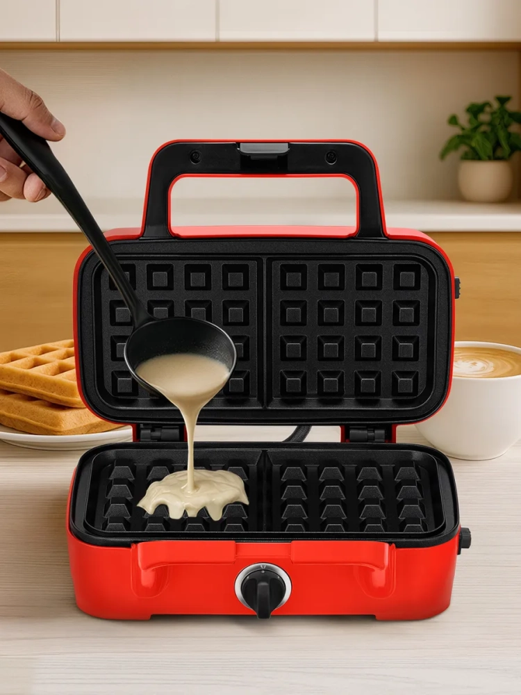 Вафельница оснащена регулятором температуры, а также индикаторами питания и нагрева. Держатели шнура сзади корпуса обеспечивают удобство хранения. Зажим на ручке удерживает крышку вафельницы в закрытом состоянии, что делает готовку, транспортировку и хранение более удобными.