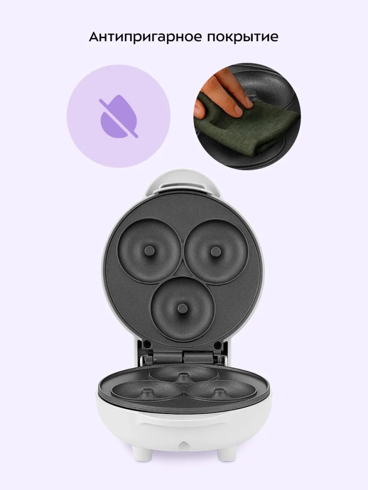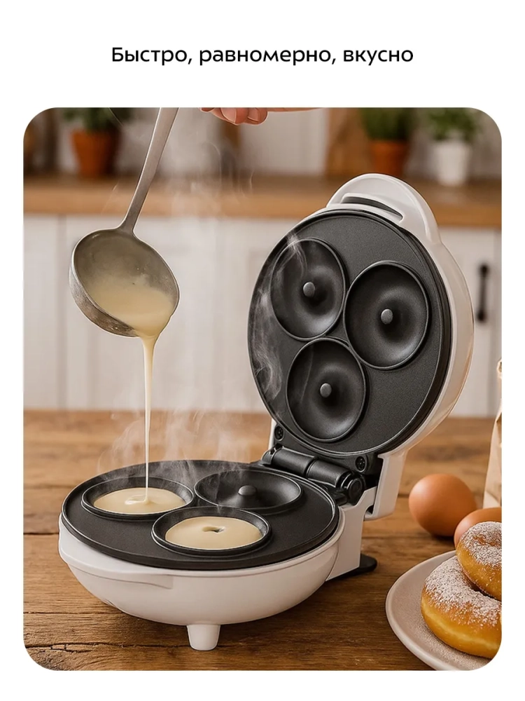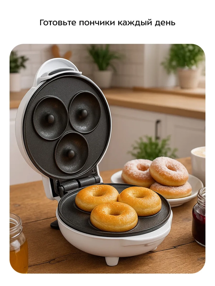С помощью электрической вафельницы Kitfort КТ-4630 вы сможете печь маленькие пончики. Прибор рассчитан на приготовление трех пончиков за раз. Их можно подавать в качестве десертов с мороженным, шоколадной пастой, джемом и фруктами или добавляя начинку в сами пончики.