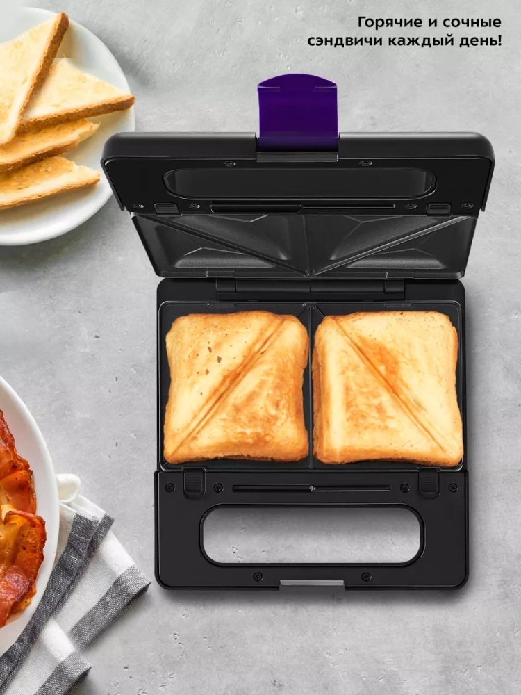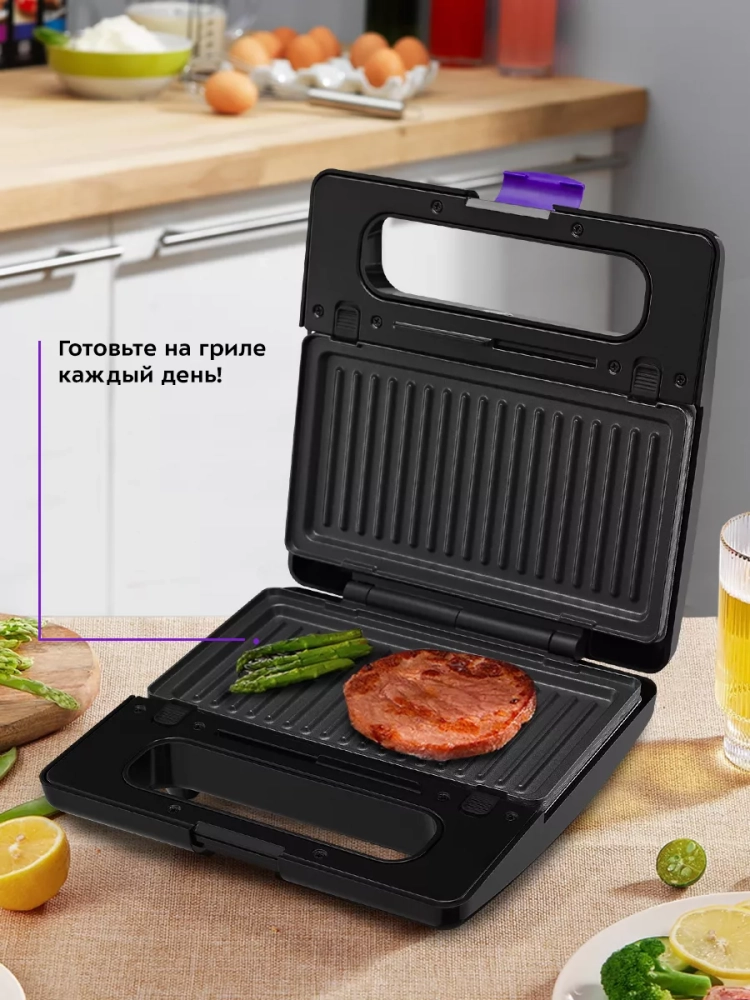 У прибора три пары панелей: панели для жарки мяса, рыбы и овощей, панели для приготовления бутербродов и панели для приготовления вафель. Высокая температура панелей способствует быстрому приготовлению продуктов. Для удобства ухода панели сделаны съемными — их можно мыть под проточной водой.