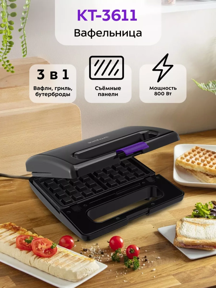 Вафельница Kitfort КТ-3611 (3 в 1) предназначена для приготовления мяса, рыбы, овощей, сосисок, бутербродов, вафель, панини, сэндвичей, гренок, тостов и многих других блюд.