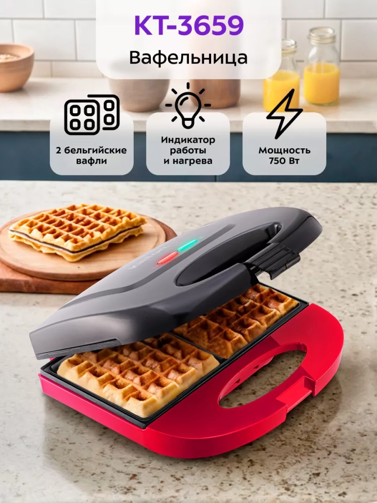 Электрическая вафельница Kitfort КТ-3659 — это идеальное решение для любителей домашней выпечки. С её помощью вы сможете приготовить сразу две аппетитные бельгийские вафли, которые порадуют вас и ваших близких. Антипригарное покрытие панелей обеспечивает легкость в использовании: тесто не прилипает, а чистка становится простой и быстрой задачей. Это позволяет готовить с минимальным количеством масла или вовсе без него, что делает процесс более здоровым. Вафельница оснащена индикаторами работы и нагрева, что упрощает контроль за процессом приготовления. Термостат поддерживает оптимальную температуру панелей для равномерного выпекания каждой вафли. Корпус устройства выполнен из прочного пластика и нержавеющей стали, что гарантирует долговечность использования. Особое внимание уделено удобству хранения: на нижней части корпуса предусмотрен отсек для шнура питания, а зажим на ручке надежно фиксирует крышку в закрытом состоянии во время транспортировки или хранения. Размеры панелей составляют 21 х 11.5 см — идеальные параметры для создания классических венских вафель. Эта бытовая электровафельница от Kitfort станет незаменимым помощником на вашей кухне благодаря своей функциональности и простоте использования. Она идеально подходит как для повседневной готовки, так и для особых случаев, когда хочется порадовать гостей вкусными десертами. Панели устройства обеспечивают равномерное распределение тепла по всей поверхности теста, создавая идеальные условия для выпечки воздушных вафель с золотистой корочкой.