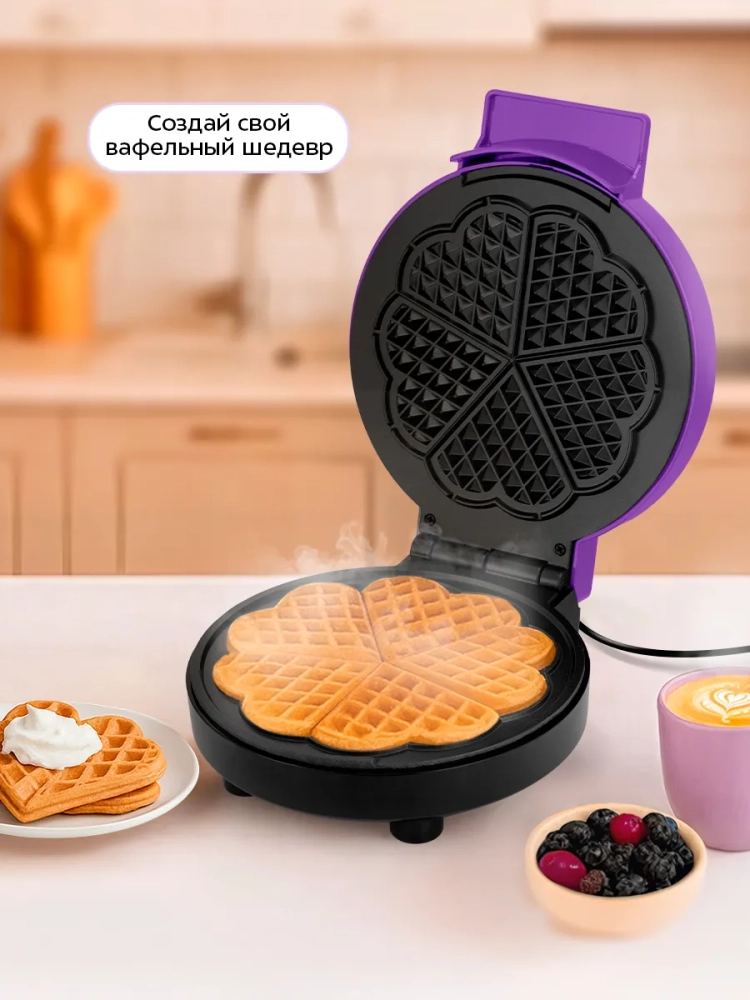 С помощью электрической вафельницы Kitfort КТ-5611 вы можете печь вафли в форме цветка, которые при желании можно разделить на пять маленьких вафель в форме сердечка. Вафельница рассчитана на приготовление одной вафли в форме цветка. Данная модель оснащена регулятором температуры, что позволит вам настраивать температуру приготовления вафель.