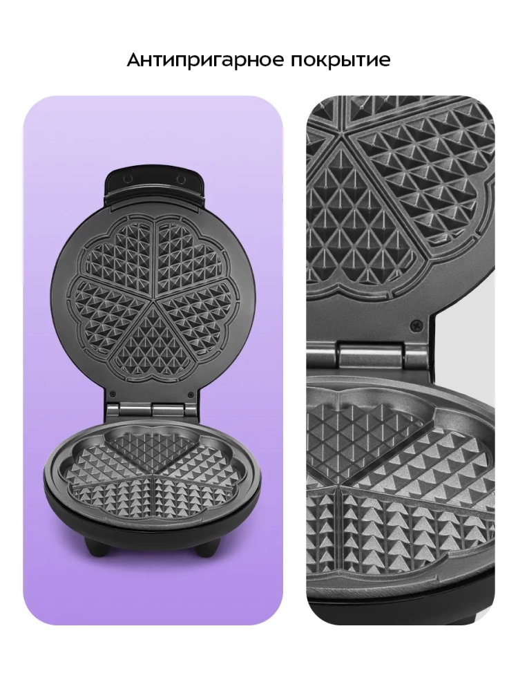 Антипригарное покрытие не дает прилипнуть тесту в процессе приготовления и позволяет готовить с минимальным количеством масла. Также антипригарное покрытие облегчает чистку панелей. Вафельница оснащена индикаторами питания и нагрева, а также термостатом для поддержания температуры панелей.