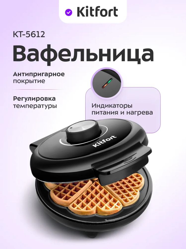 С помощью электрической вафельницы Kitfort КТ-5612 вы можете печь вафли в форме цветка, которые при желании можно разделить на пять маленьких вафель в форме сердечка. Вафельница рассчитана на приготовление одной вафли в форме цветка. Данная модель оснащена регулятором температуры, что позволит вам настраивать температуру приготовления вафель.