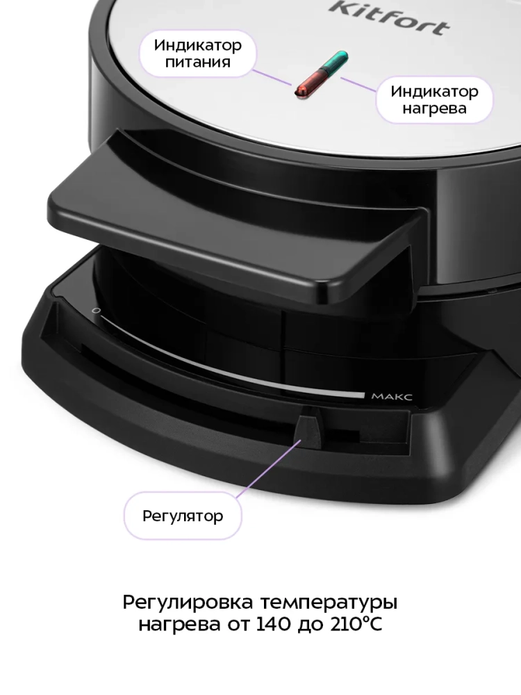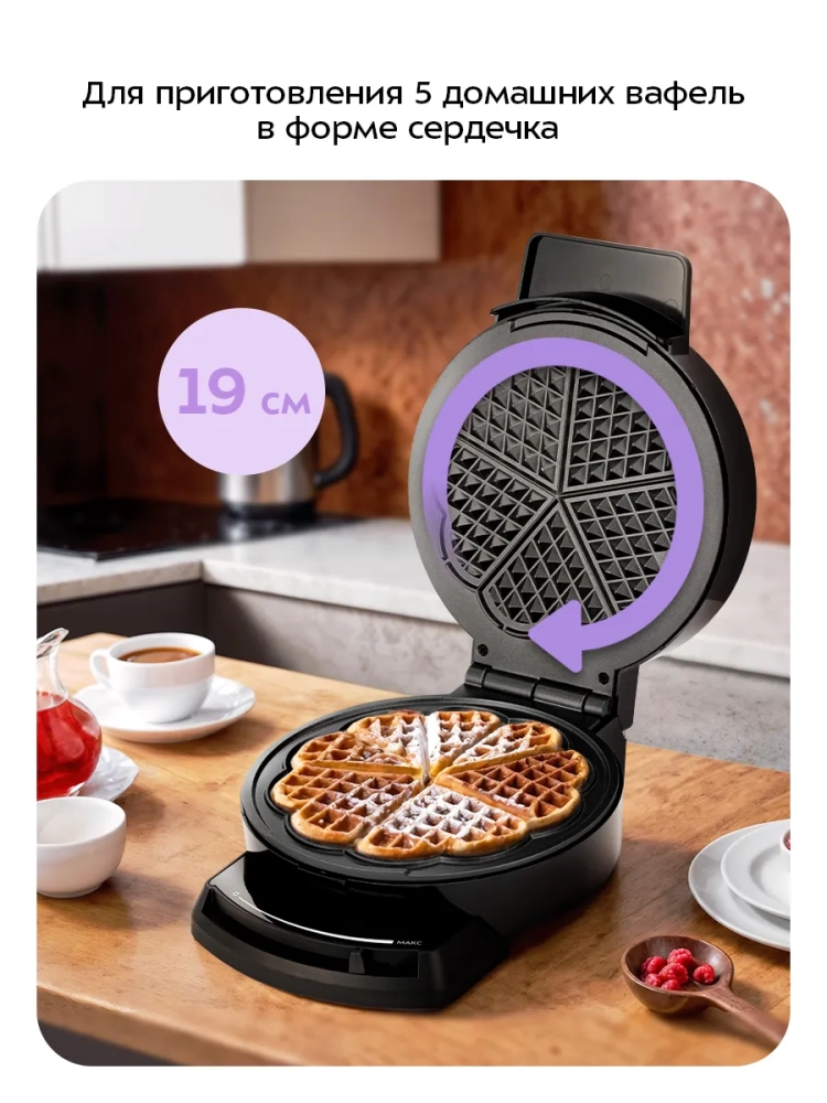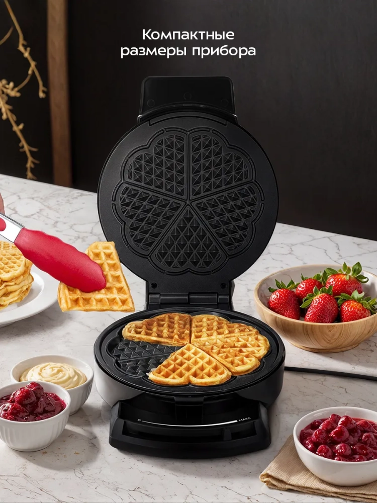 С помощью электрической вафельницы Kitfort КТ-5616 вы можете печь вафли в форме цветка, которые при желании можно разделить на пять маленьких вафель в форме сердечка. Вафельница рассчитана на приготовление одной вафли в форме цветка. Данная модель оснащена регулятором температуры, что позволит вам настраивать температуру приготовления вафель.
